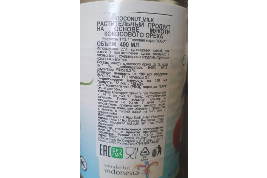 | Состав | Мякоть кокосового ореха 62%, вода 37,7%, (стабилизаторы E466, E415, эмульгатор E435) 0,3% |