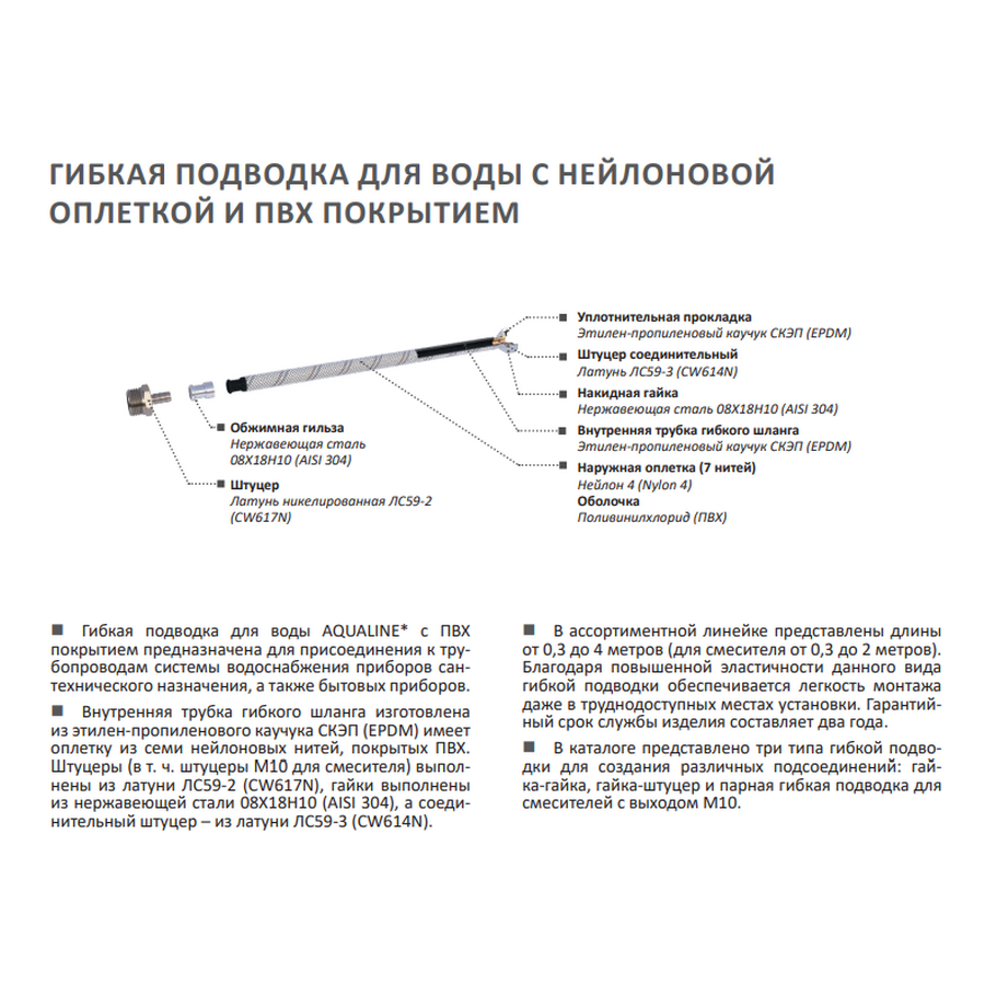 AQUALINE Подводка гибкая для воды нейлон/ПВХ (стальная гайка) (вн-вн, г/г) 1/2" - 30 см, 4860