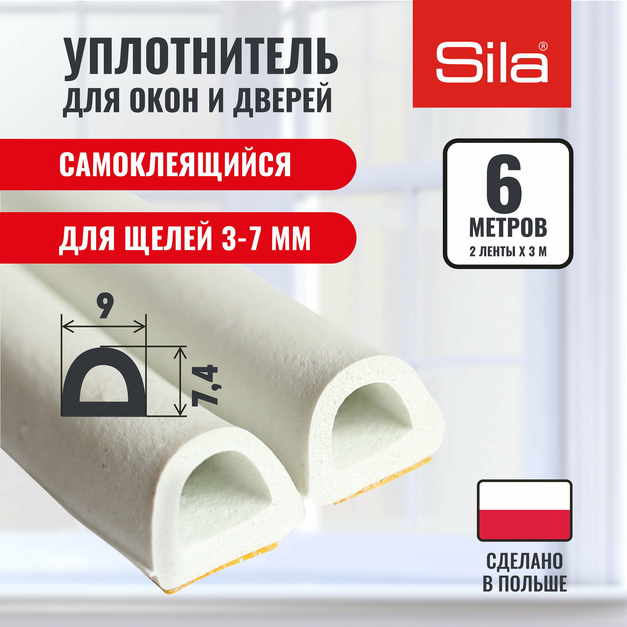 Купить Уплотнитель для окон и дверей SILA D-профиль, 9х7,4мм, 6 метров (2х3м), белый, самоклеящийся SILADW6