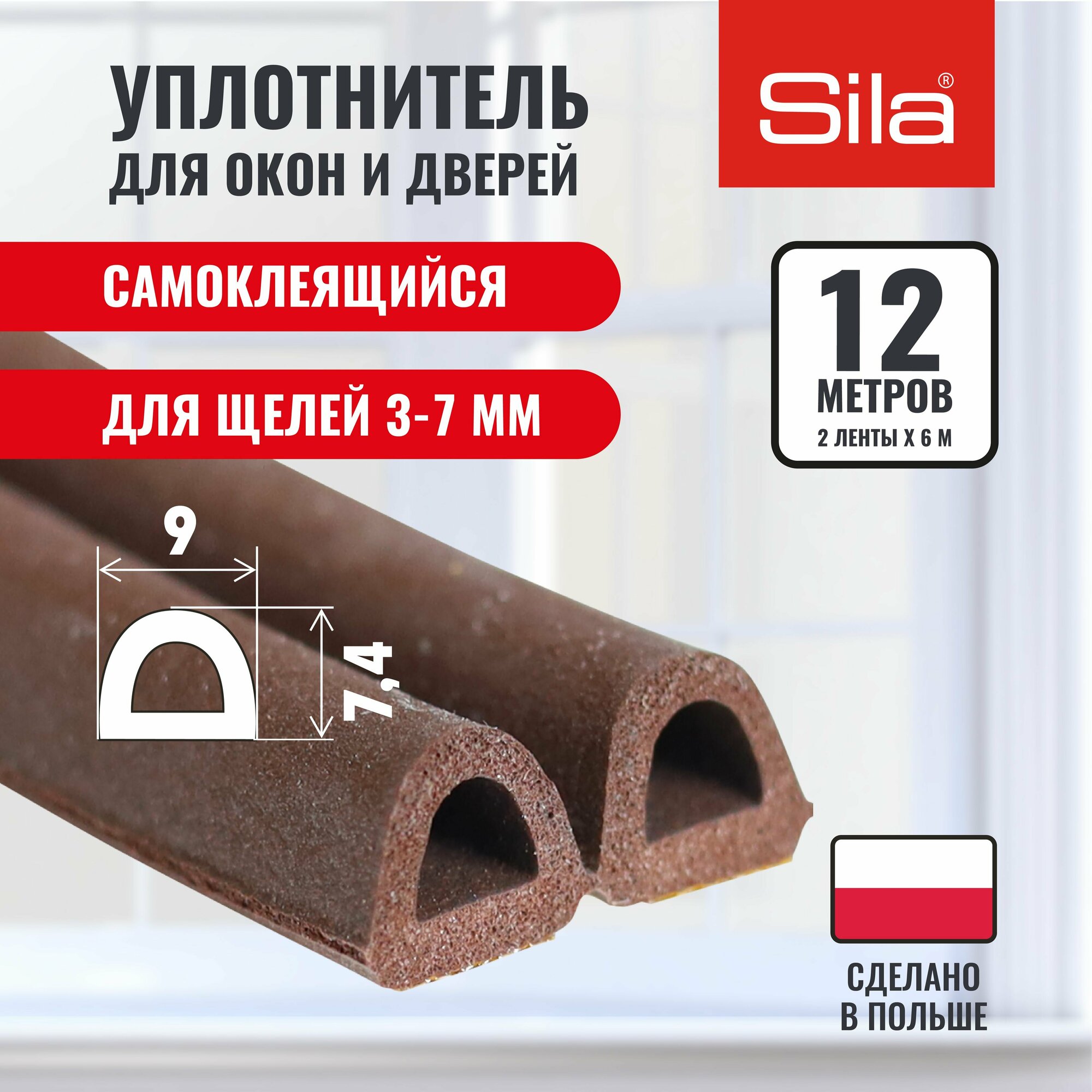 Уплотнитель для окон и дверей SILA D-профиль, 9х7,4мм, 12 метров (2х6м), коричневый, самоклеящийся SILADВ12