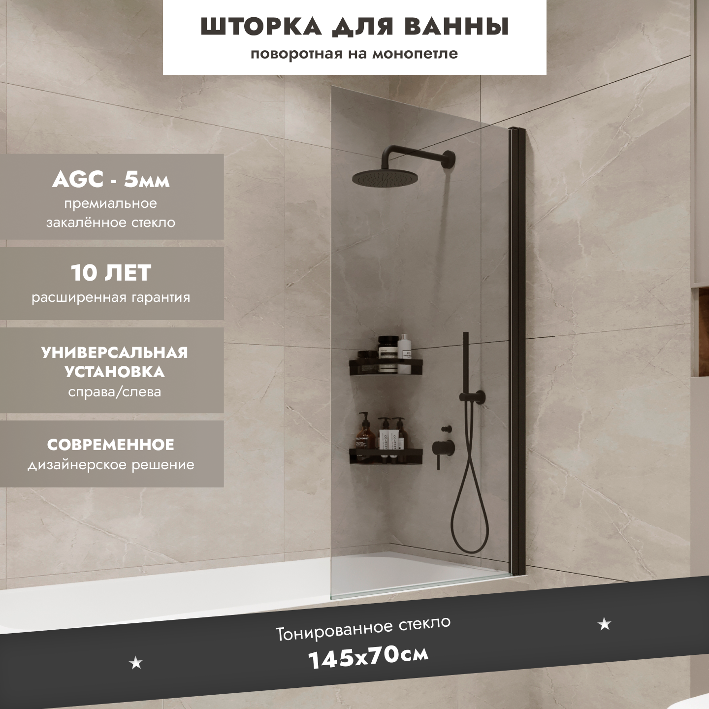 Стеклянная перегородка (шторка, ширма) на борт ванны поворотная на монопетле черный профиль тонированное стекло интересное: