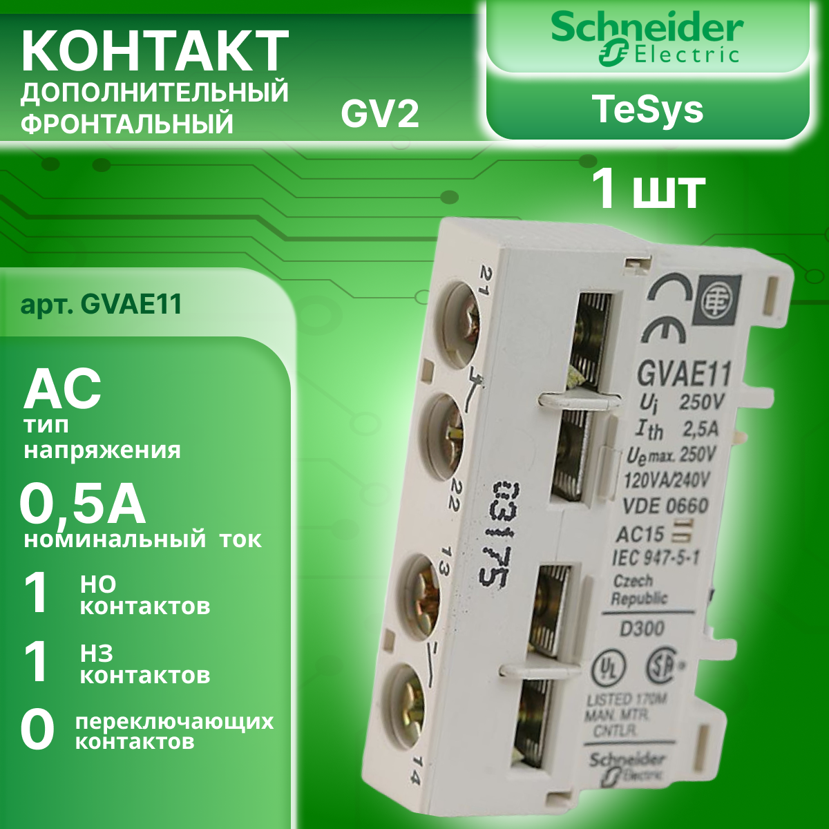 Контакт дополнительный фронтальный для GV2 1А 1НО 1НЗ Schneider Electric 1шт