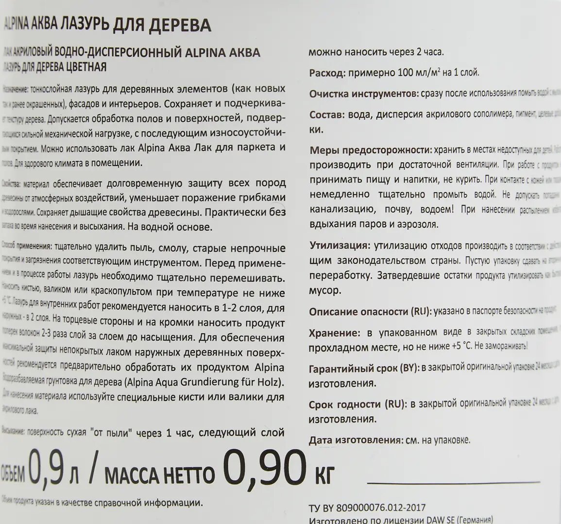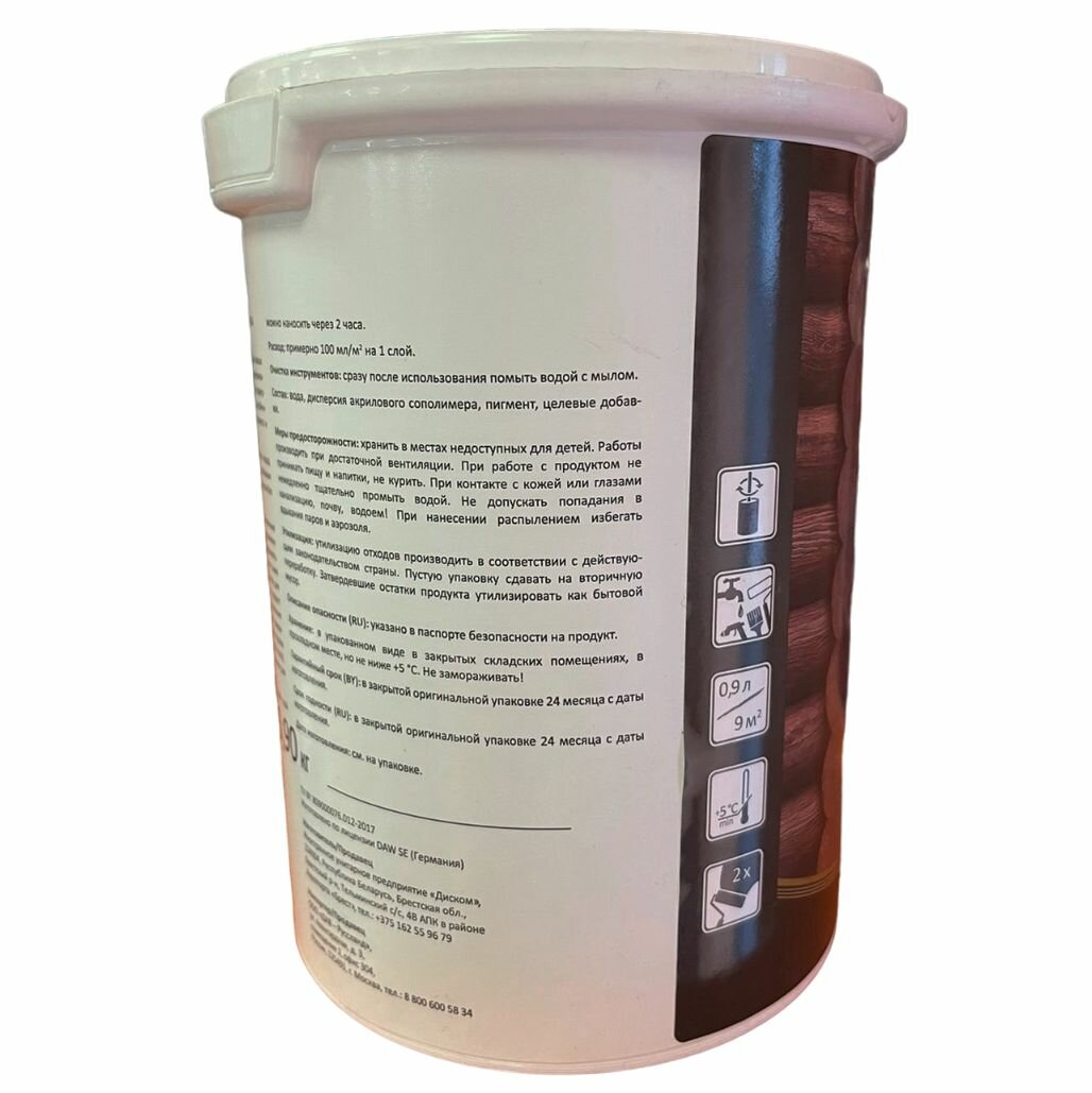 | Дополнительная информация | акриловая; влажность древесины не должна превышать для лиственных пород 12% и хвойных пород 15%; не применять при температуре воздуха и подложки ниже +5°C; нанесение следующего слоя лака, эмали или лазури - через 2 часа |