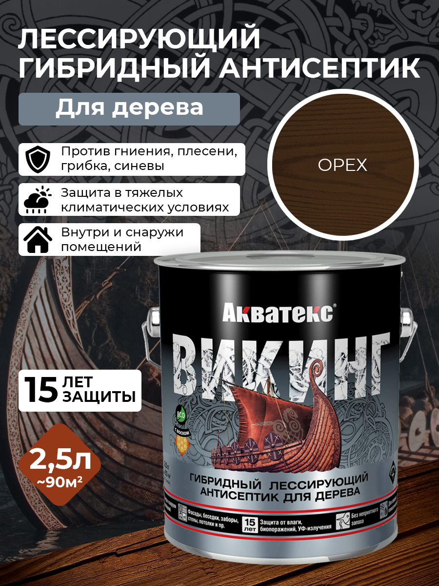 Антисептик лессирующий Акватекс викинг для дерева , пропитка для наружных и внутренних работ, 2,5 л сосна