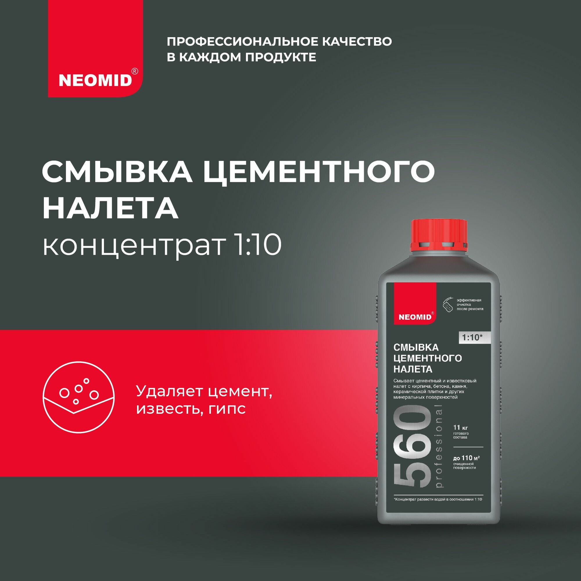 Neomid 560 смывка цементного налета (1 л) концентрат 1:10 / Удаление цементных, известковых и гипсовых загрязнений