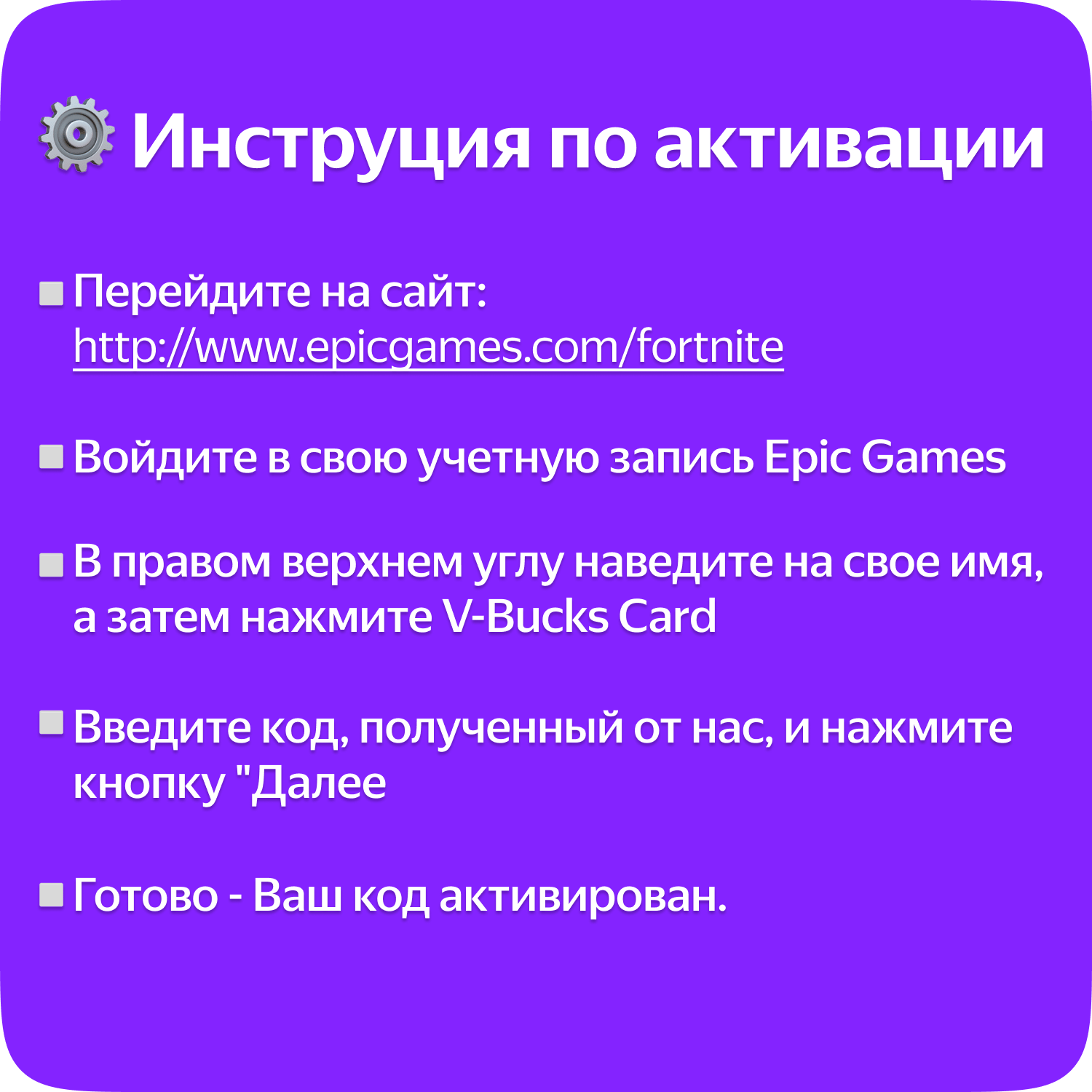 | Инструкция по активации | Чтобы обменять В-баксы, введите код на Fortnite/vbuckscard. Для использования кода V-Bucks требуется учетная запись Epic Games. После ввода кода на Fortnite/vbuckscard выберите платформу, на которой вы хотите использовать В-баксы. |