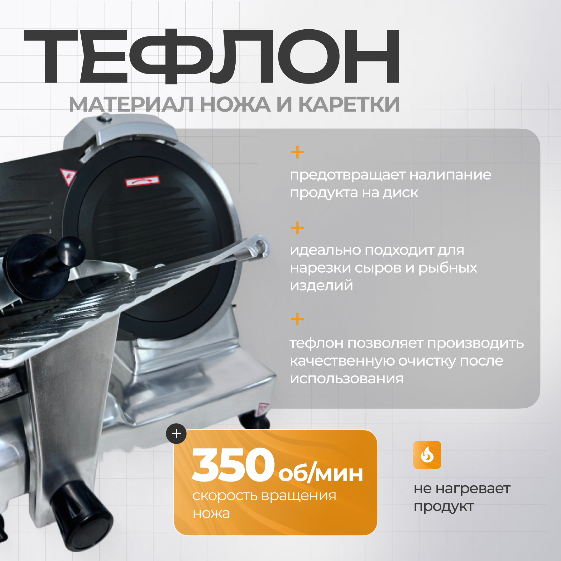 Слайсер для нарезки электрический профессиональный Crazy Pan с тефлоновым покрытием CP-SLTEF250S, 0.15 кВт, полуавтоматический, 220В, диаметр ножа 250 мм, толщина нарезки 0.2-12мм, 20 кг