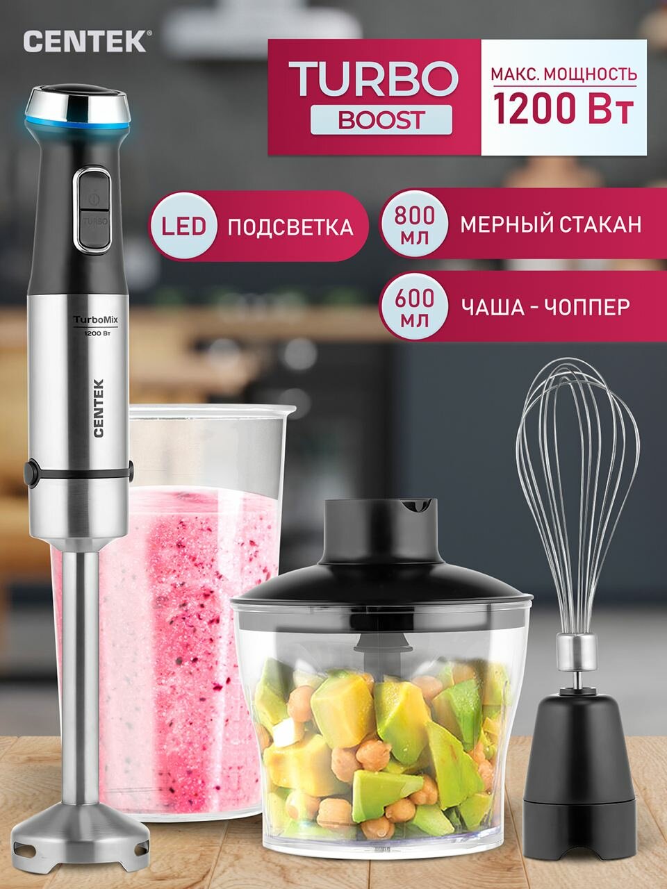 Блендер Погружной 1200ВТ 4ПРЕДМЕТА Чаша 0.6Л Стакан 0.8Л Турбо МЕТ Нога LED Подсв Centek