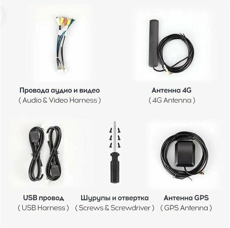 | Подробная комплектация | Головное устройство Схема подключения проводов Антенна GPS+Антенна 4G 2 USB провода Питающий провод ISO Шурупы и отвертка Салфетка из микрофибры Электронная инструкция |