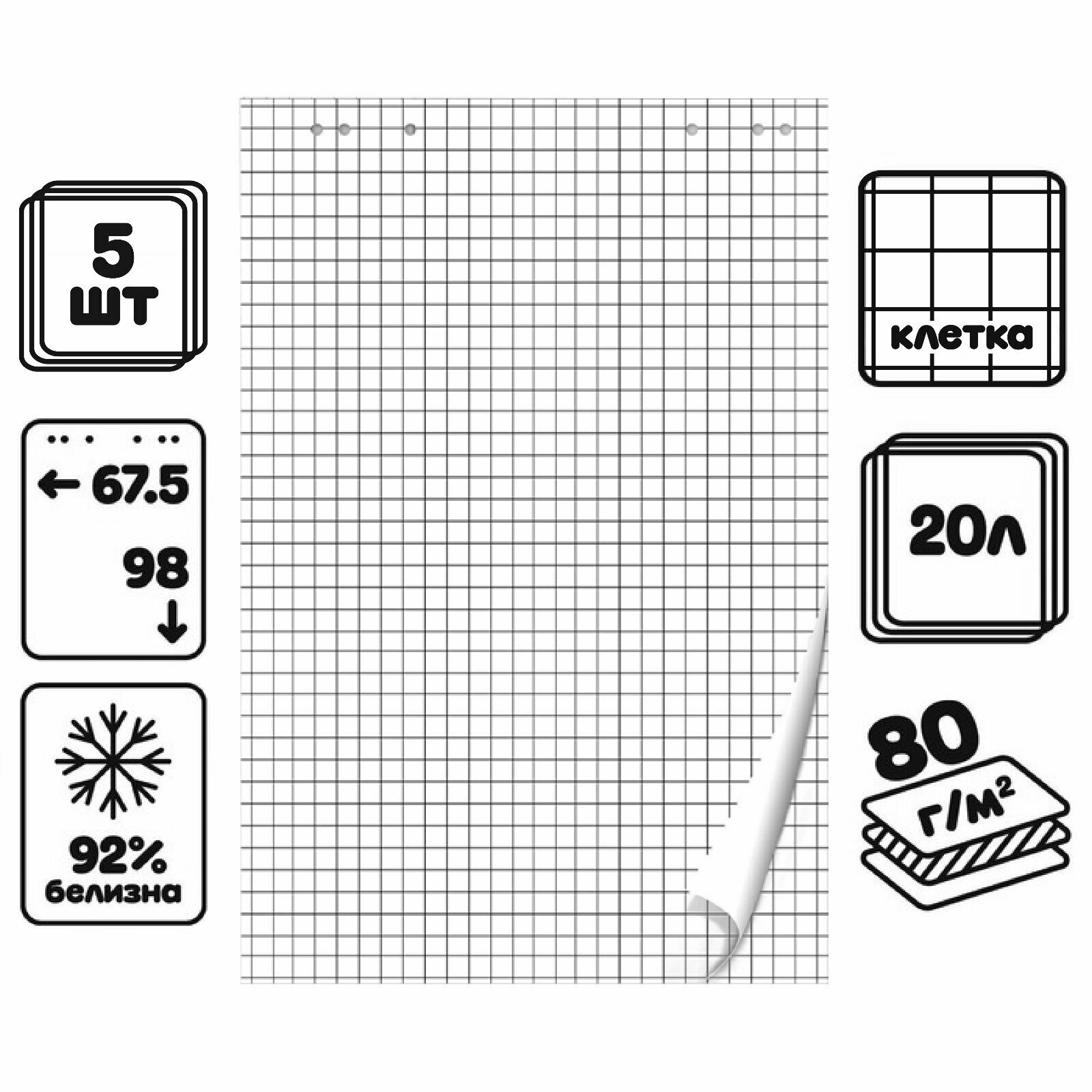 Набор блокнотов 5 штук для флипчарта, 67.5 x 98 см, 20 листов в клетку, 92%, 80 г/м2