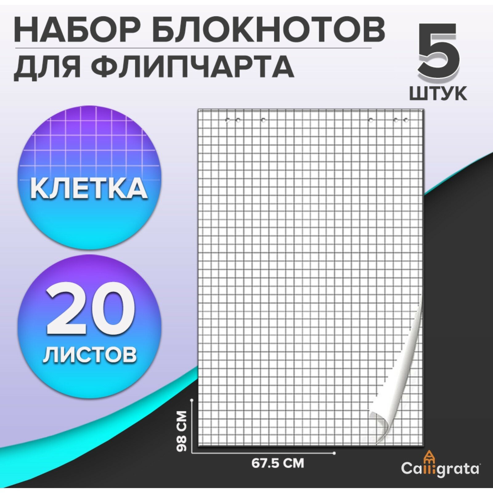 Набор блокнотов 5 штук для флипчарта, 67,5 х 98 см, 20 листов в клетку, 92%, 80 г/м2, Calligrata