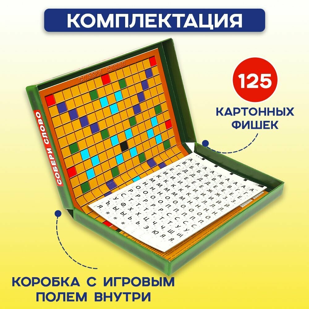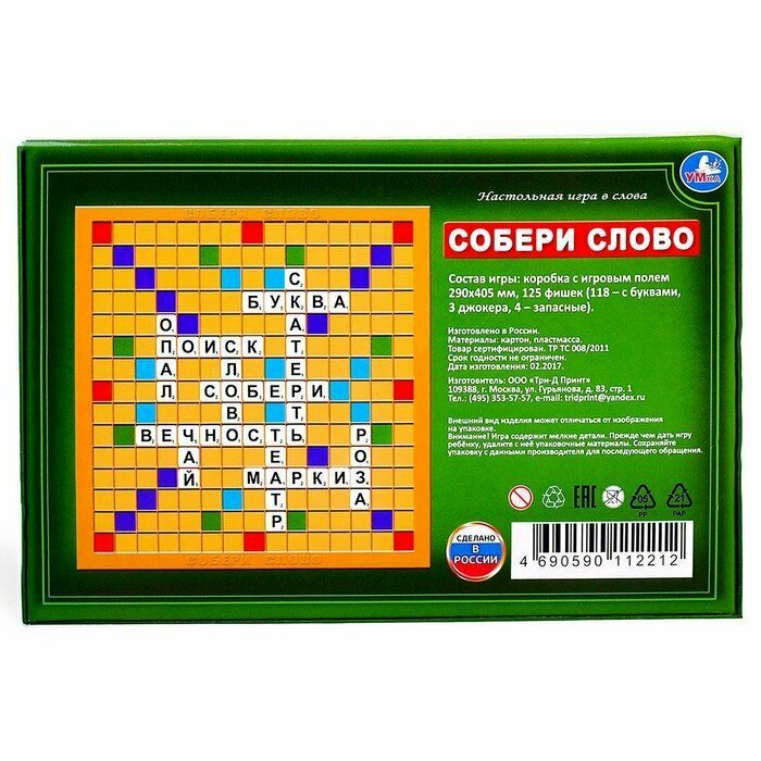 | Комплектация | коробка с игровым полем и инструкцией, 125 фишек (118 - с буквами, 3 джокера, 4 - запасные) |