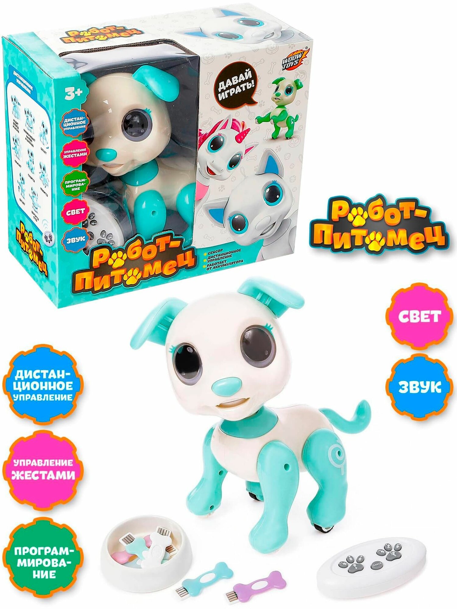 | Комплектация | робот, пульт ДУ, 6 электронных "косточек", usb-провод для зарядки, миска для косточек |