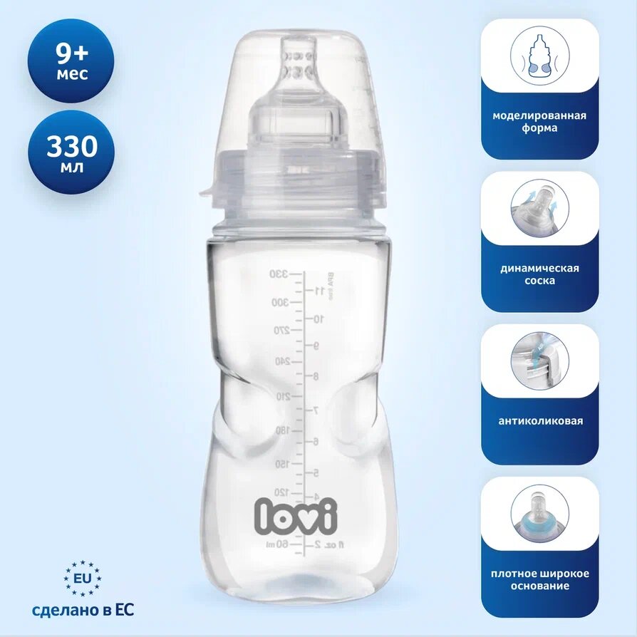 | Дополнительная информация | Антиколиковая бутылочка для кормления Lovi в комплекте с динамической силиконовой пустышкой. |