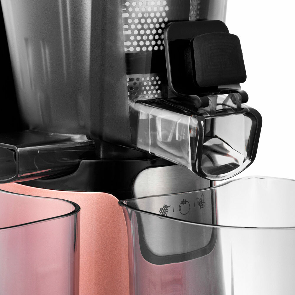 Сухой жмых Качественный сок Три вида продукта - сок, сок с мякотью, сорбет Легко разбирать и мыть, щетка для мытья в комплекте Красивая компактная Контейнер для сока и жмыха |