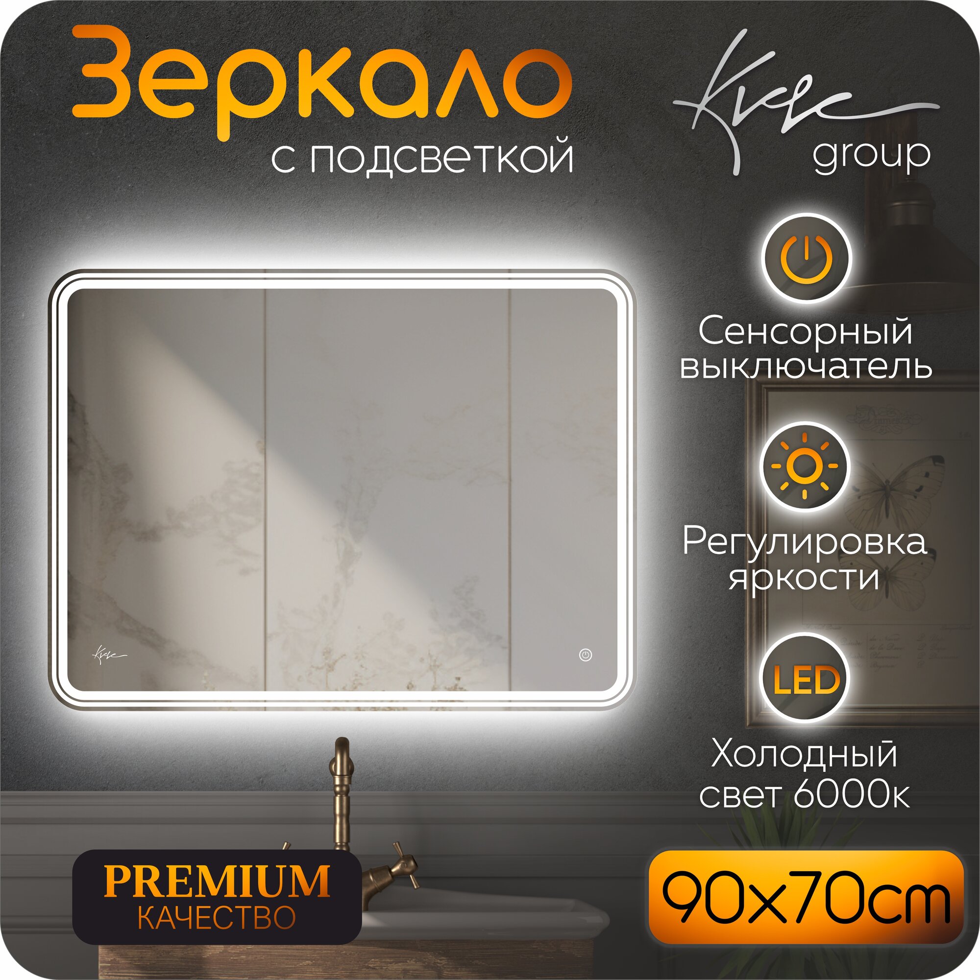 Зеркало в ванную KVVgroup Malta 90х70 см с фронтальной LED-подсветкой (настенное для ванной, влагостойкое с сенсорным управлением, интерьерное, прямоугольное, холодная подсветка 6000К)
