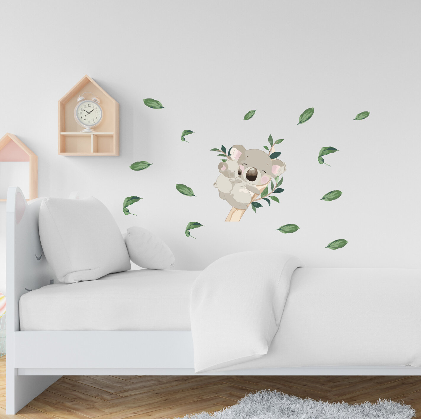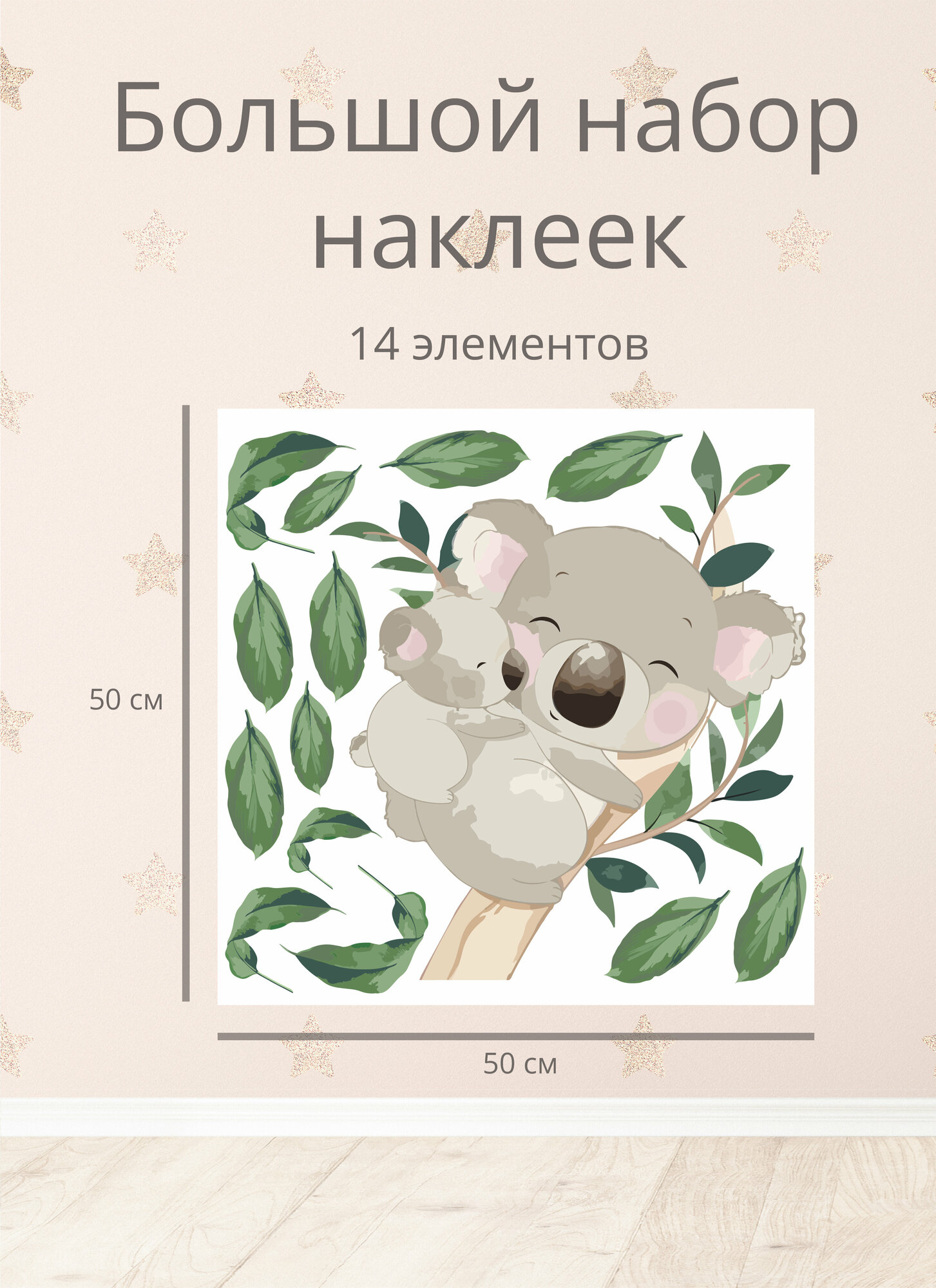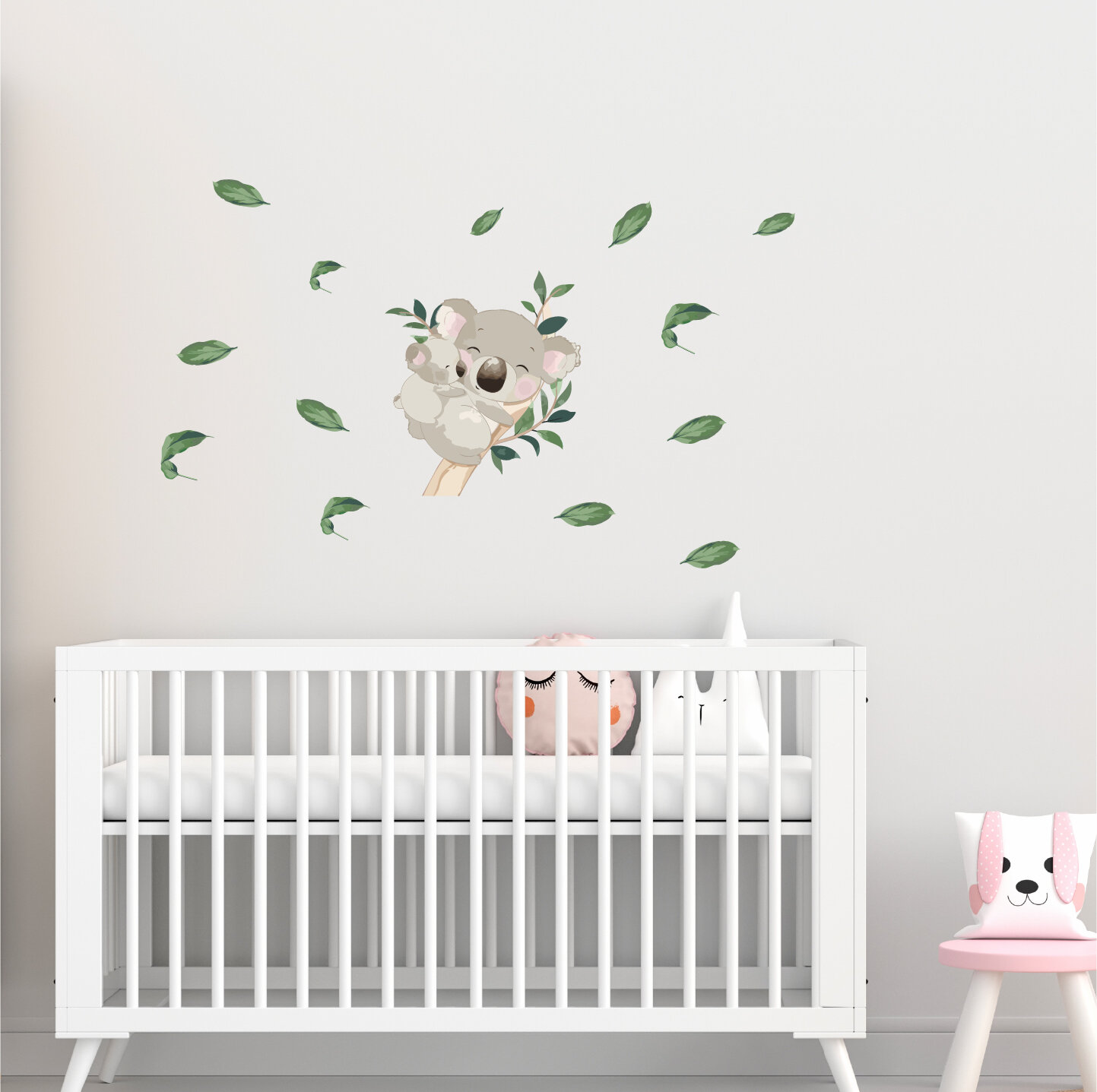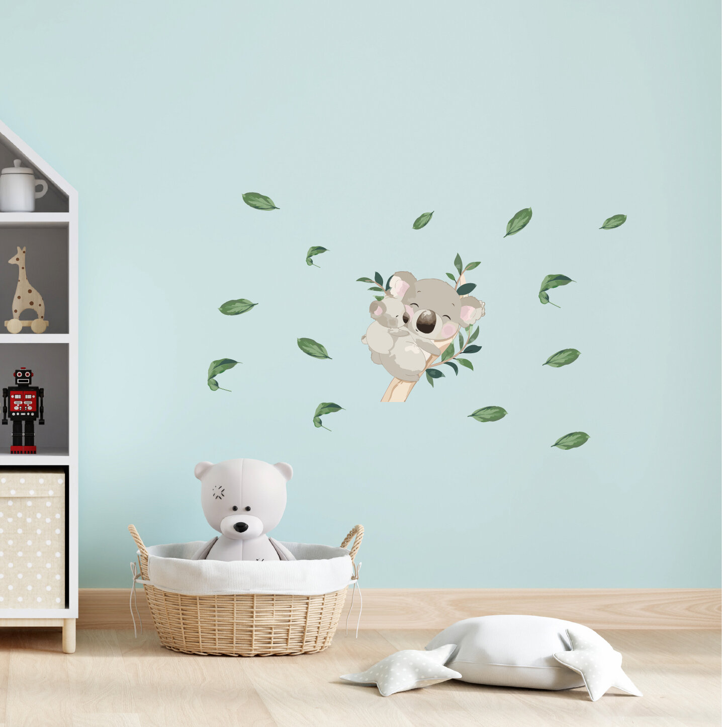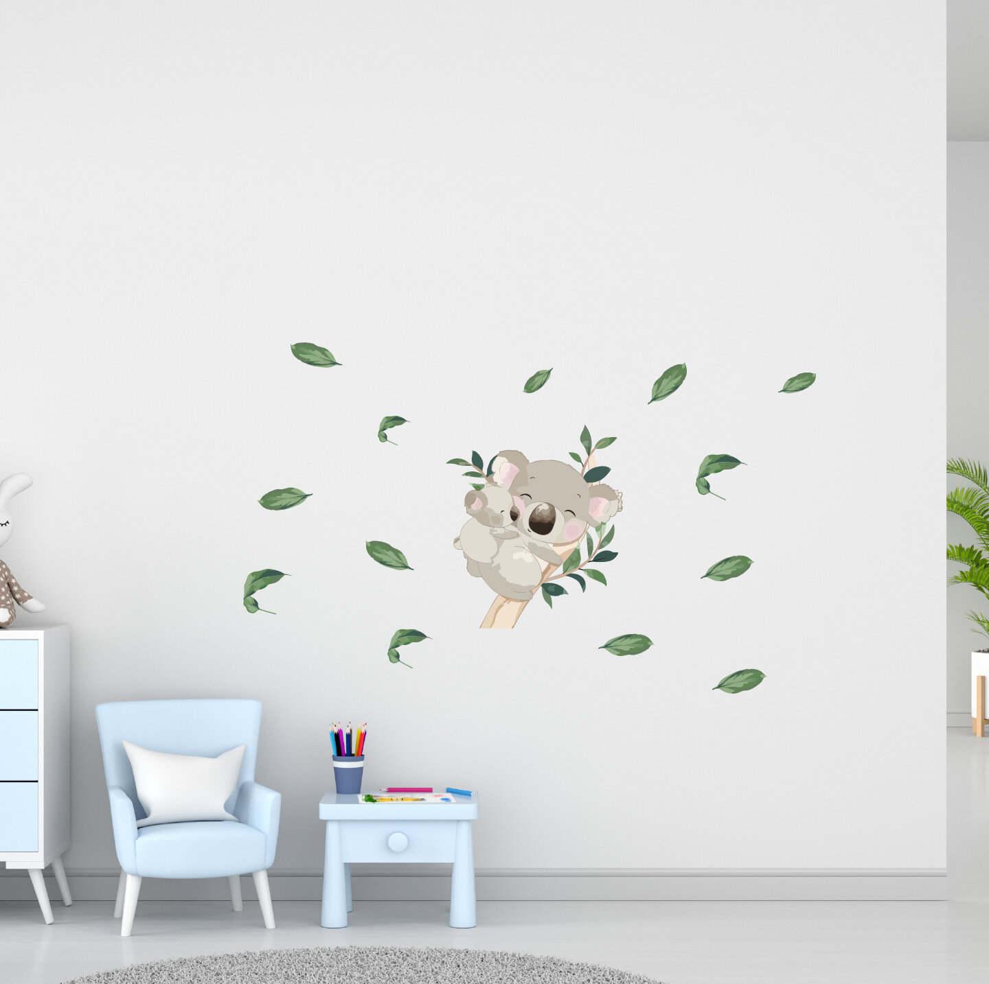 Детская интерьерная большая наклейка с коалой и малышом в листьях