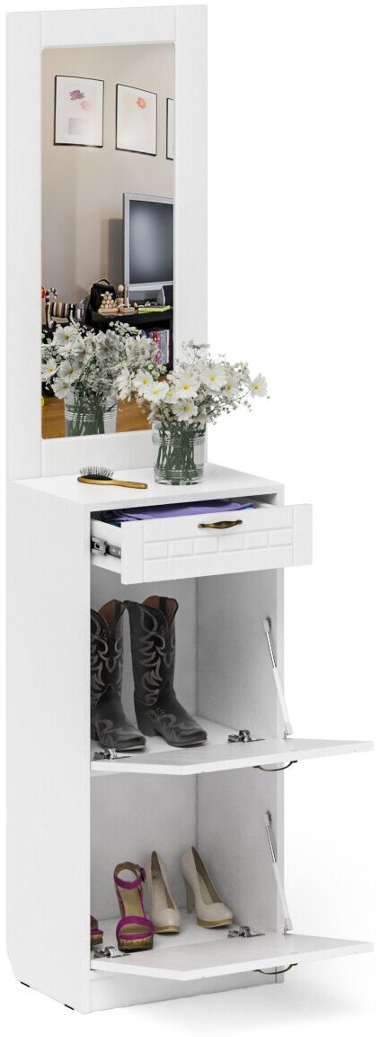 Купить Тумба для обуви 2 секции с зеркалом П-6, цвет белая шагрень/фасады МДФ белое дерево фрезеровка прованс, ШхГхВ 50х35х210 см.