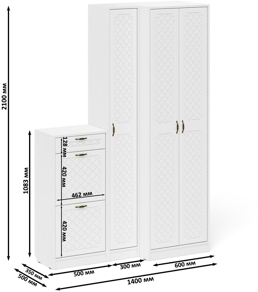 Обувница П-6 две секции с пеналом и шкафом, цвет белая шагрень/фасады МДФ белое дерево фрезеровка ромб, ШхГхВ 140х50х210 см, универсальная сборка