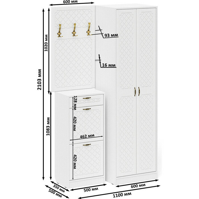 Прихожая Мебельный двор П-6 Компоновка № 17 белая шагрень/фасады МДФ белое дерево фрезеровка ромб (1024872)