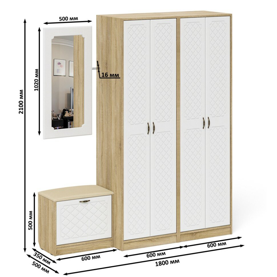 | Особенности | для маленькой прихожей, мягкое сиденье, с местом для сидения, со штангой для вешалок, шкаф с зеркалом |