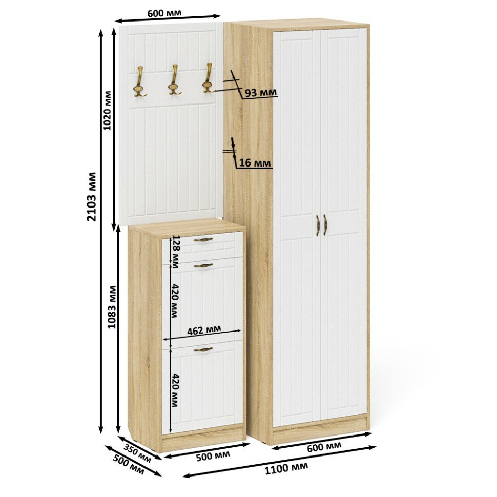 Прихожая Мебельный двор П-6 Компоновка № 17 дуб сонома/фасады МДФ белое дерево фрезеровка ромб (1025040)