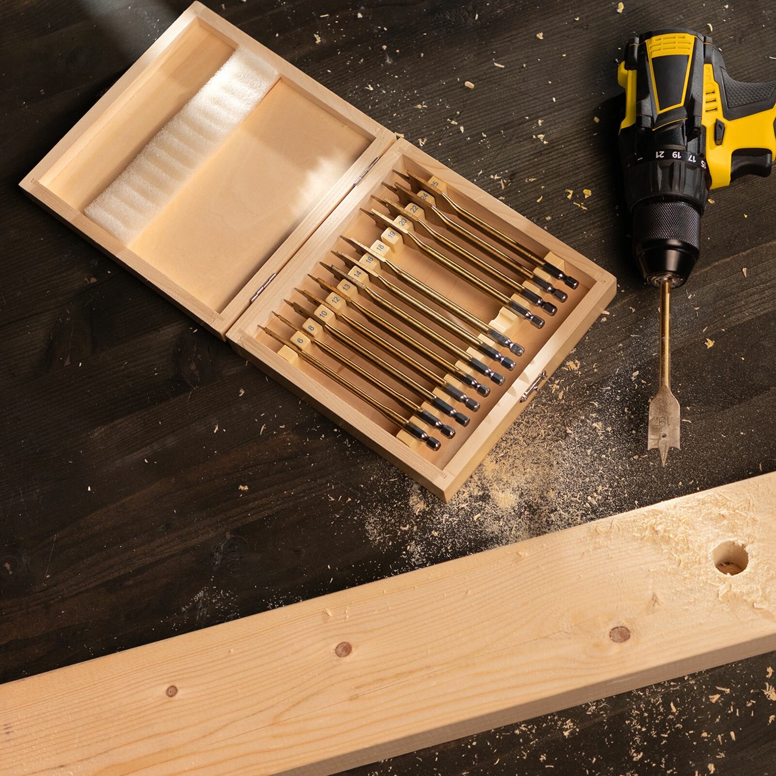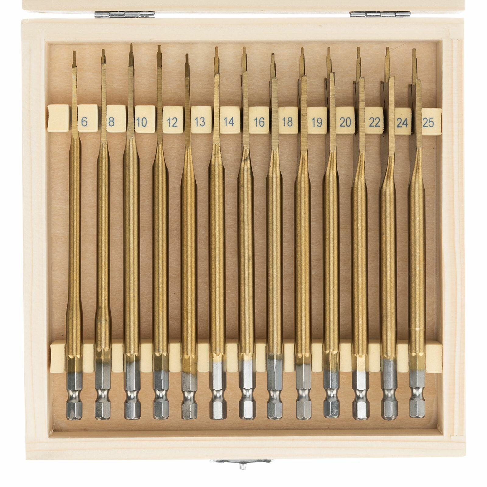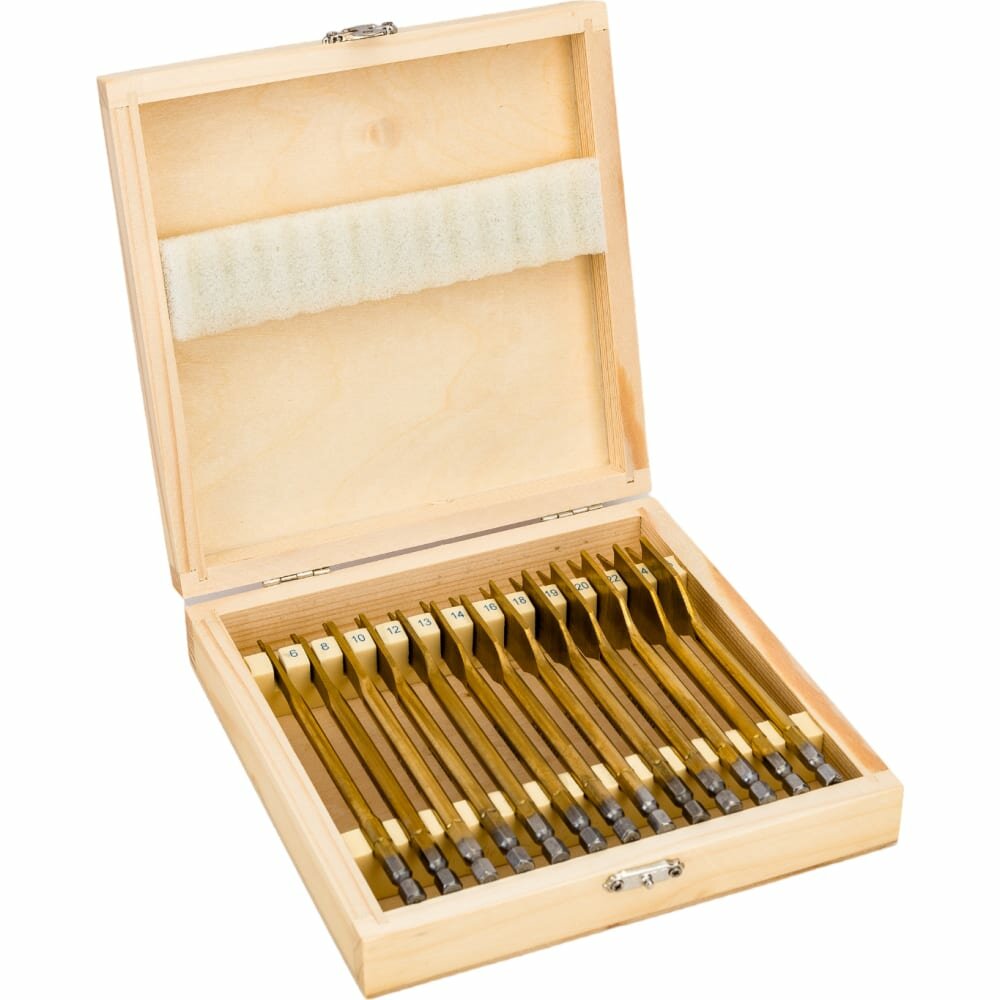 Набор сверл перовых по дереву, 6-8-10-12-13-14-16-18-19-20-22-24-25 мм, 13 шт, деревянный кейс Matrix