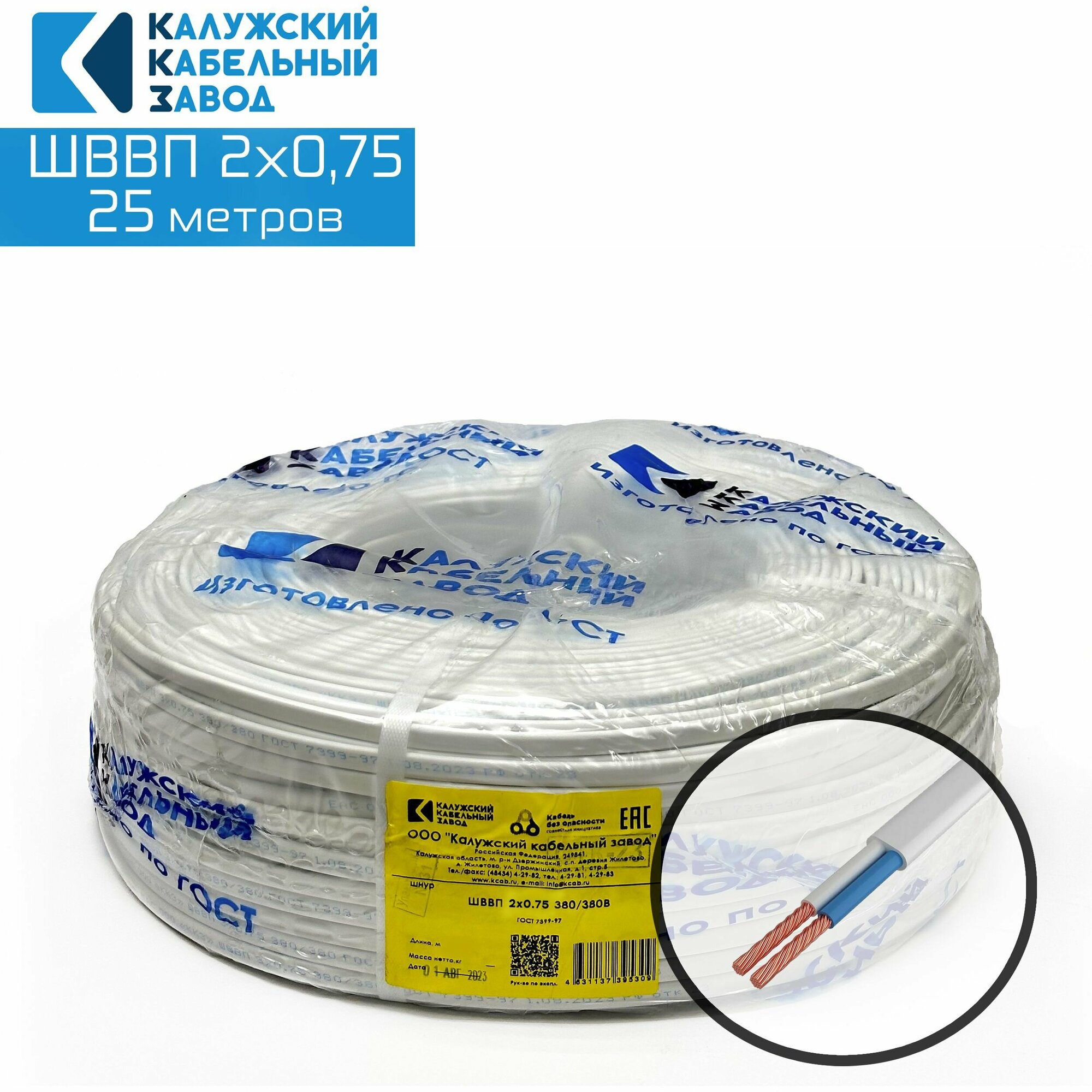 Провод ШВВП 2х0,75 ГОСТ 25метров ГОСТ Калужский кабельный завод Белый