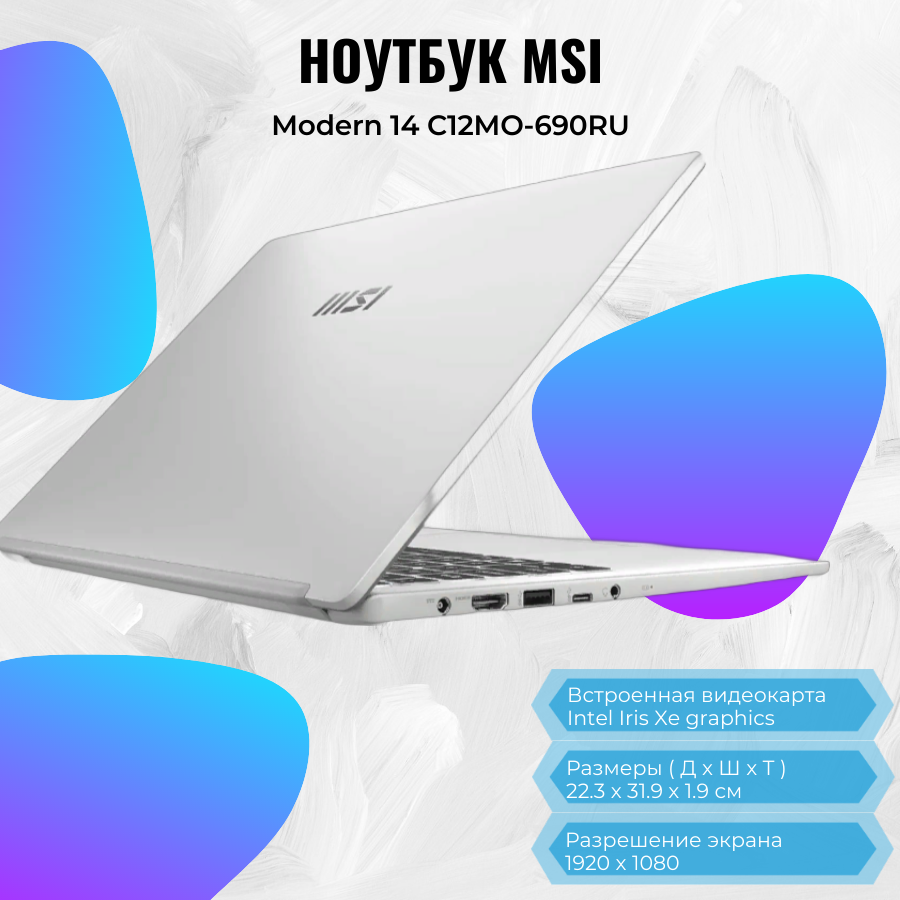 Ультрабук MSI Modern 14 C12MO-690RU, 14", IPS, Intel Core i3 1215U, DDR4 8ГБ, SSD 256ГБ, Intel UHD Graphics, серебристый (9s7-14j111-690)
