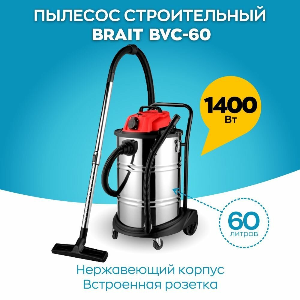 Пылесос строительный BRAIT BVC-60 (220В, 1400Вт, подключ. инструмент 2000 Вт, пылесборник 60л, шланг 3м)
