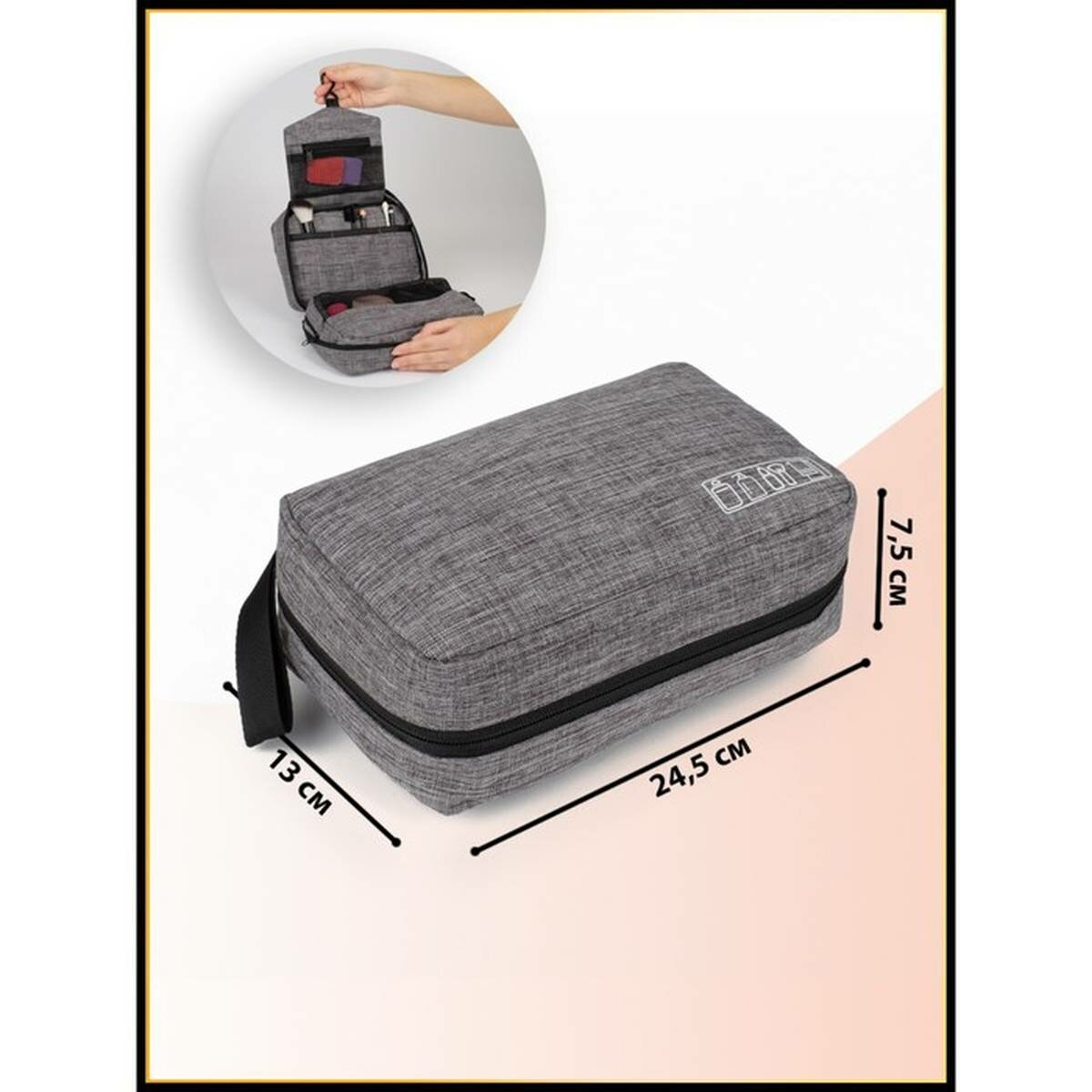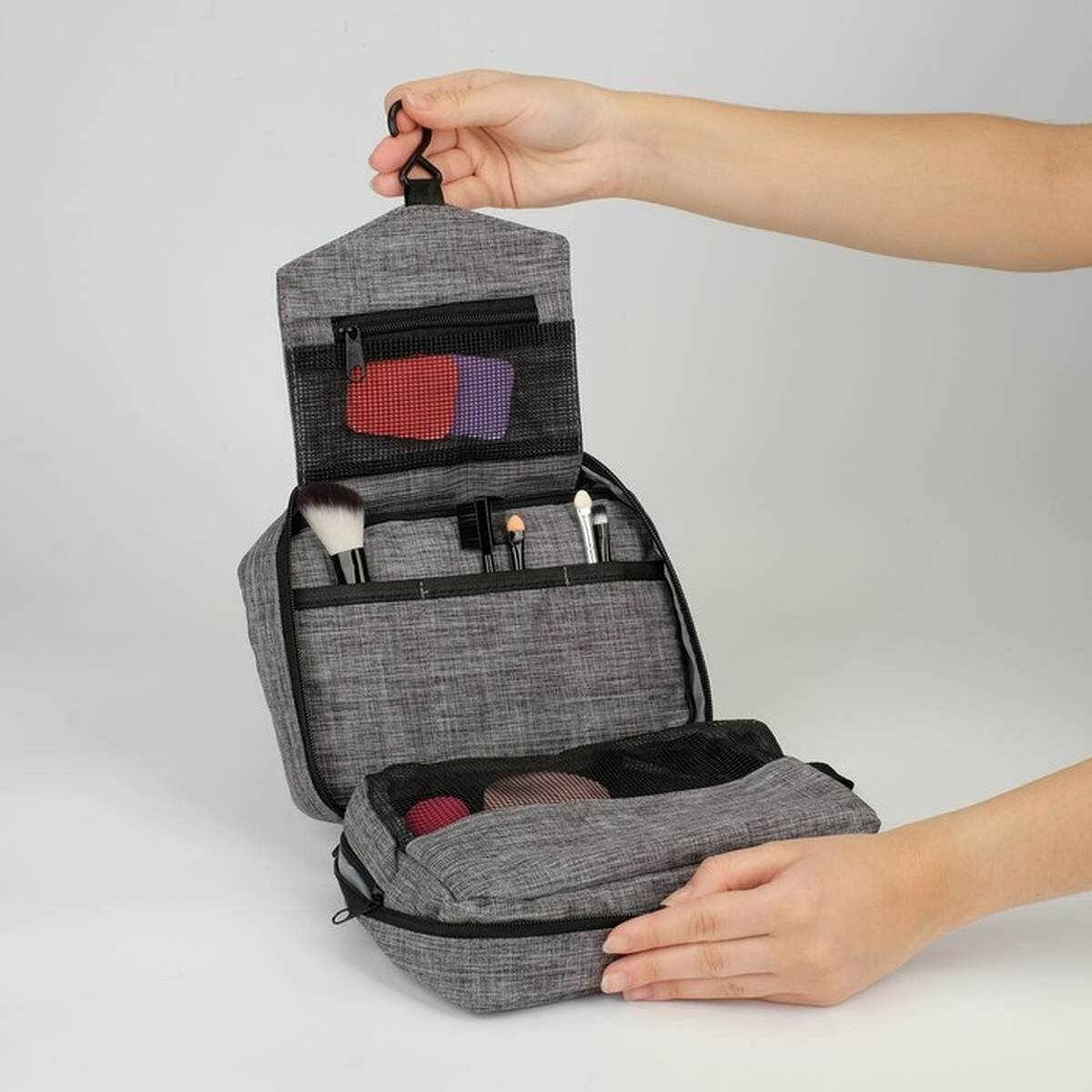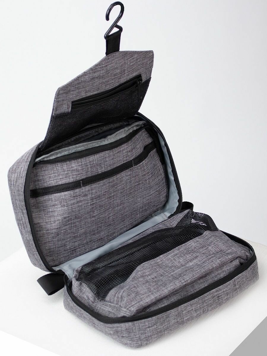 Косметичка дорожная, 2 отдела на молниях, с крючком, цвет серый