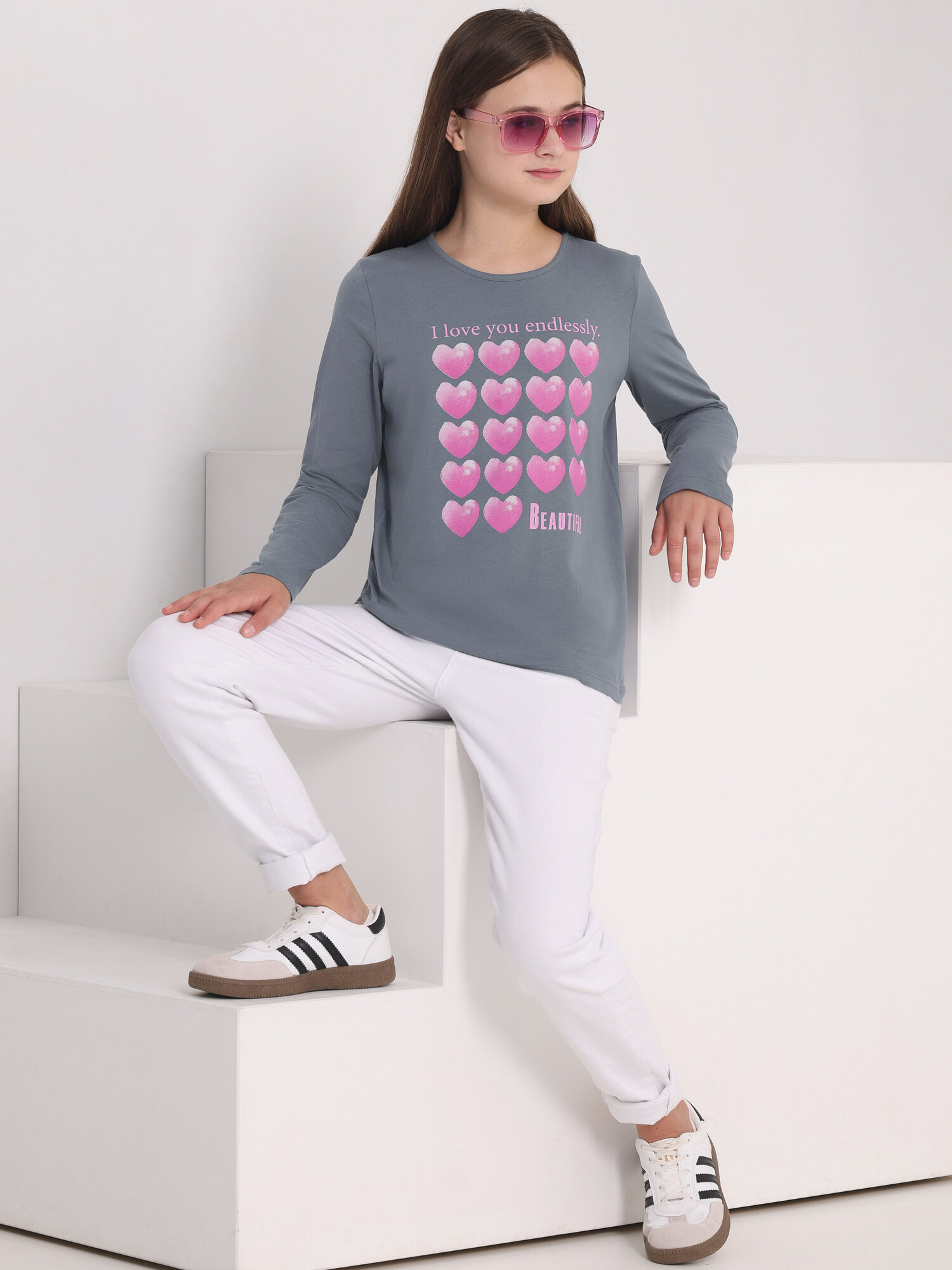 Купить Лонгслив для девочки подростка с принтом хлопок 100% Апрель 1ДДЛД4192001/1119/2341/*/3488/*/*/* серый 84-158