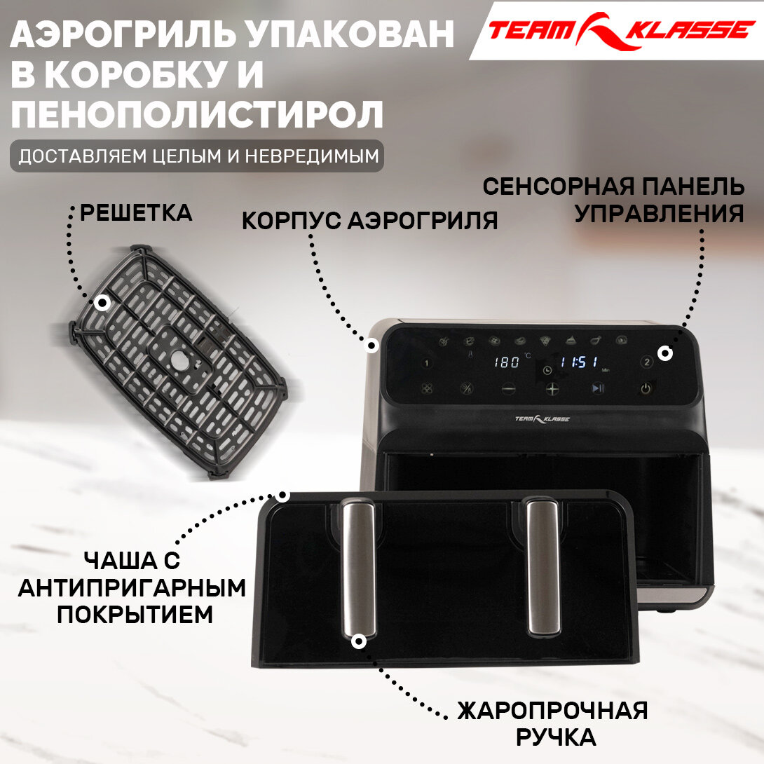 Аэрогриль Team Klasse 802T аэрофритюрница, решетка, 1700 Вт и 8 программ, объем 8 л, приготовление без масла до 200 градусов, с антипригарным покрытием, таймер, цвет черный интересное: