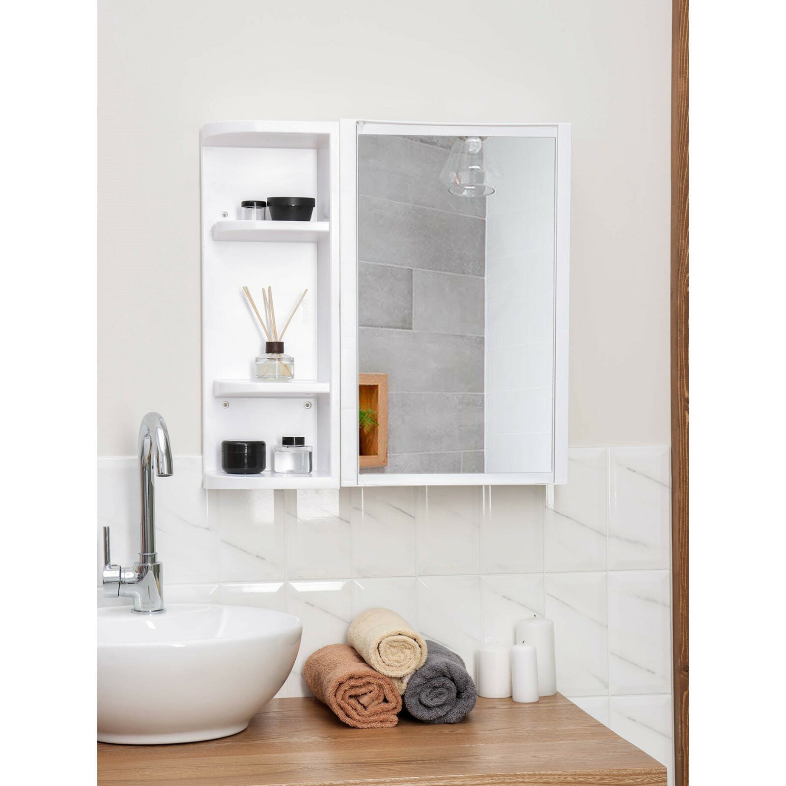 | Особенности | без увеличения, зеркало-шкаф, полочка, с рамой |