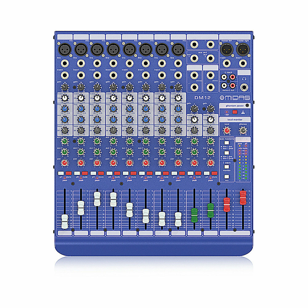 MIDAS DM12 - аналоговый микшер, 12 каналов (2 стерео), 8 мик.преампов MIDAS, 8 инсертов, 2 AUX