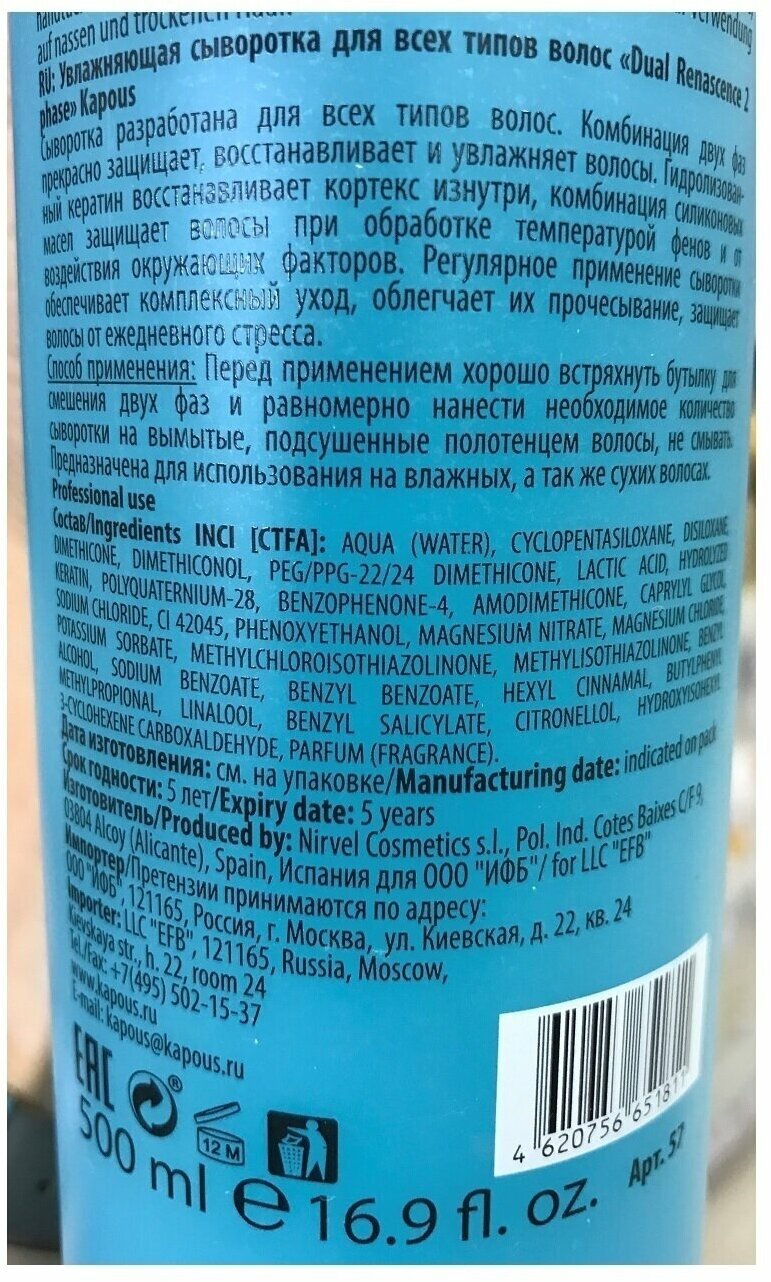 Увлажняющая сыворотка Kapous Dual Renascence 2phase, 500 мл