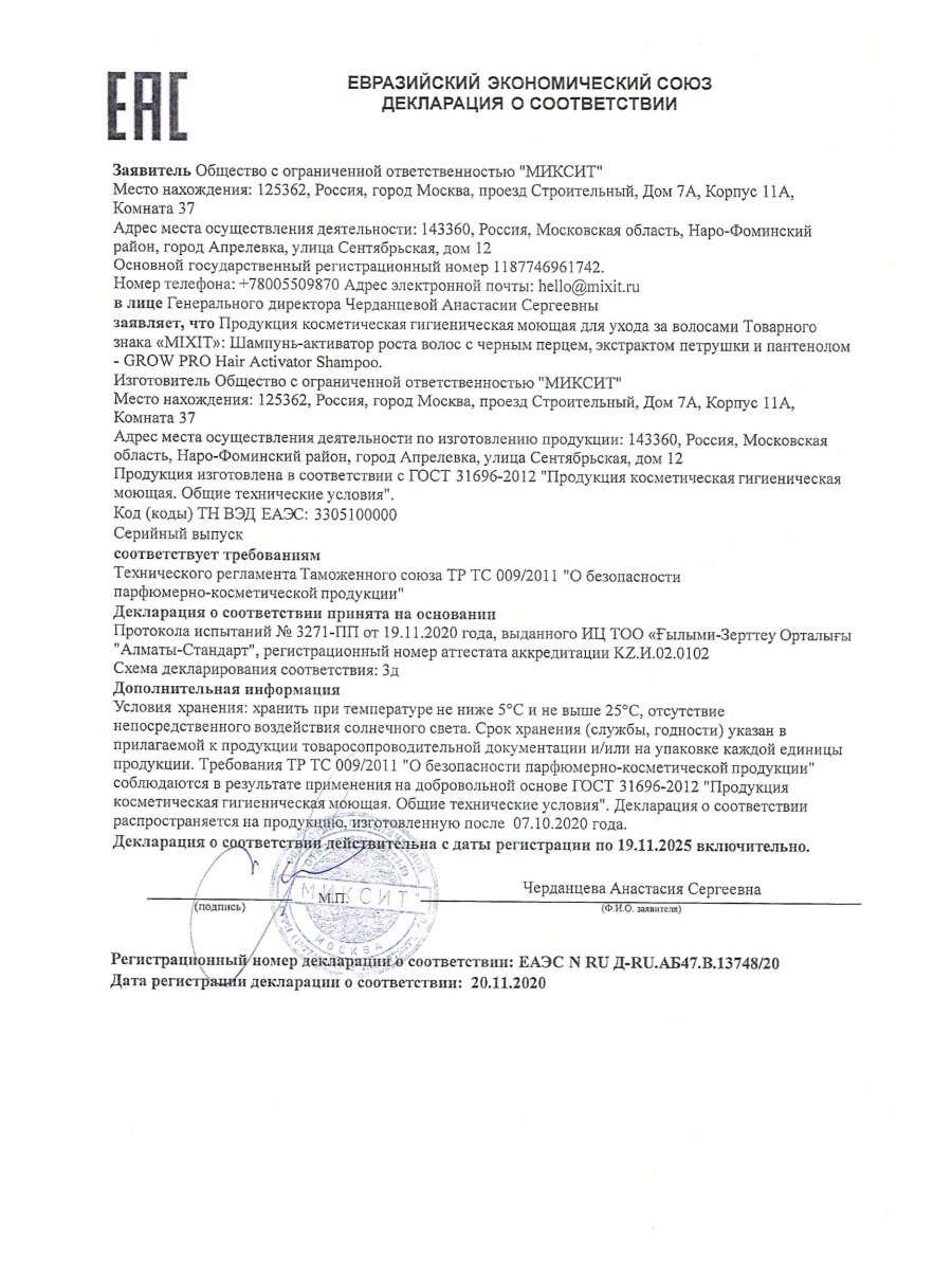 | Способ применения | Нанеси на влажные волосы, вспень, смой водой. Повтори при необходимости. Подходит для ежедневного использования |