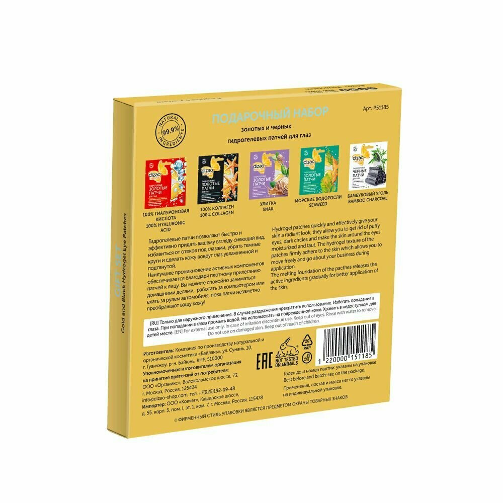 | Дополнительная информация | в наборе 5 пар золотых и черных патчей для глаз; состав набора: гидрогелевые золотые патчи для глаз «100% гиалуроновая кислота», гидрогелевые золотые патчи для глаз «100% коллаген», гидрогелевые золотые патчи для глаз с фильтратом секрета улитки и гиалуроновой кислотой «Улитка», гидрогелевые золотые патчи для глаз «Морские водоросли», гидрогелевые черные патчи для глаз «Бамбуковый уголь» |