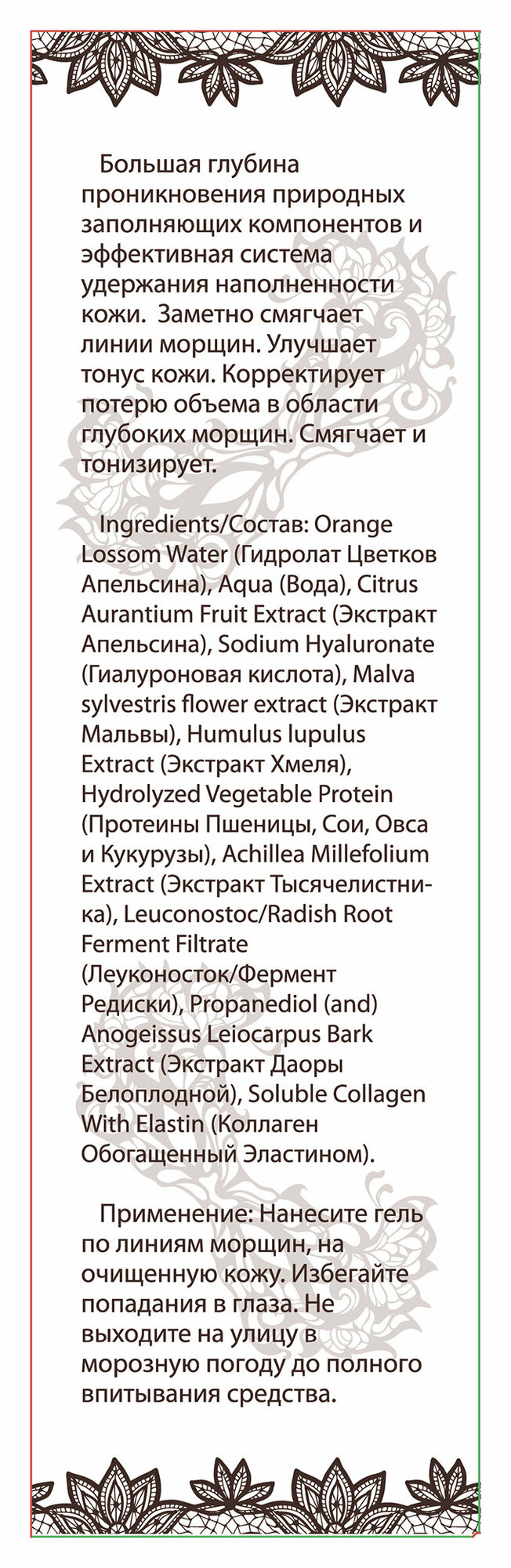 | Способ применения | Нанесите гель по линиям морщин, на очищенную кожу. Избегайте попадания в глаза. Не выходите в морозную погоду до полного впитывания средства. |
