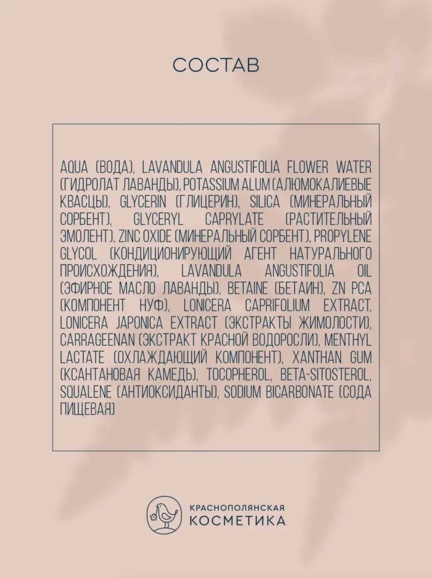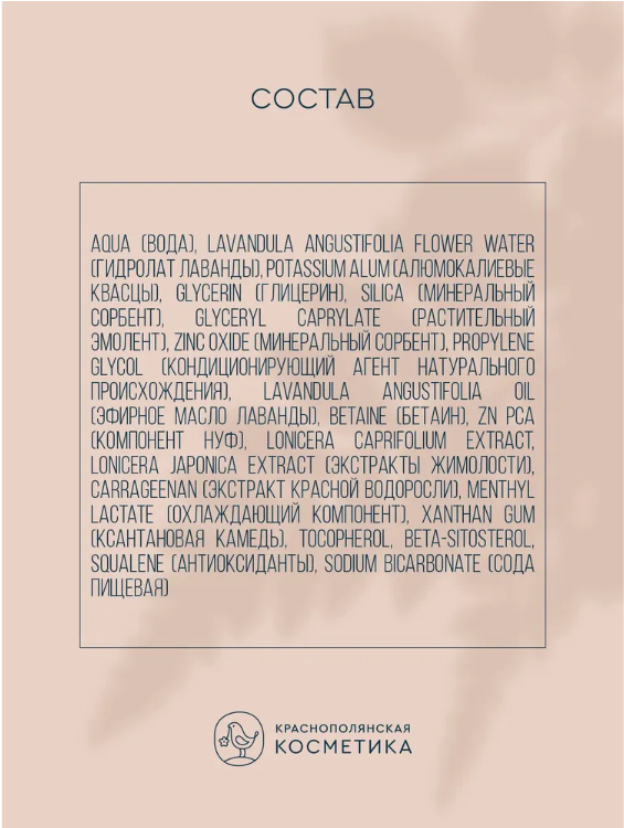 | Полный состав | Aqua (Вода), Citrus Reticulata Fruit Water (Гидролат мандарина), Potassium Alum (Алюмокалиевые квасцы), Glycerin (Глицерин), Silica (Минеральный сорбент), Glyceryl Caprylate (Растительный эмолент), Zinc Oxide (Минеральный сорбент), Propylene Glycol (Кондиционирующий агент натурального происхождения), Ванилин (Vanillin), Betaine (Бетаин), Zn PCA (Компонент НУФ), Lonicera Caprifolium Extract, Lonicera Japonica Extract (Экстракты жимолости), Parfum (Натуральная парфюмерная композиция), Sclerotium Gum (Камедь склероции), Carrageenan (Экстракт красной водоросли), Menthyl Lactate (Охлаждающий компонент), Xanthan Gum (Ксантановая камедь), Tocopherol, Beta-Sitosterol, Squalene (Антиоксиданты), Sodium Bicarbonate (Сода пищевая). |