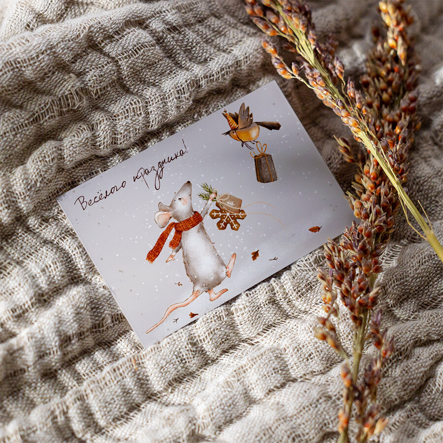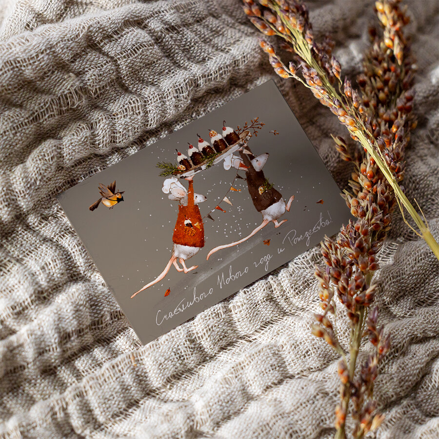 Новогодние мини открытки "Звери из сказки", набор 5 шт. Сказочные иллюстрации и теплые пожелания.