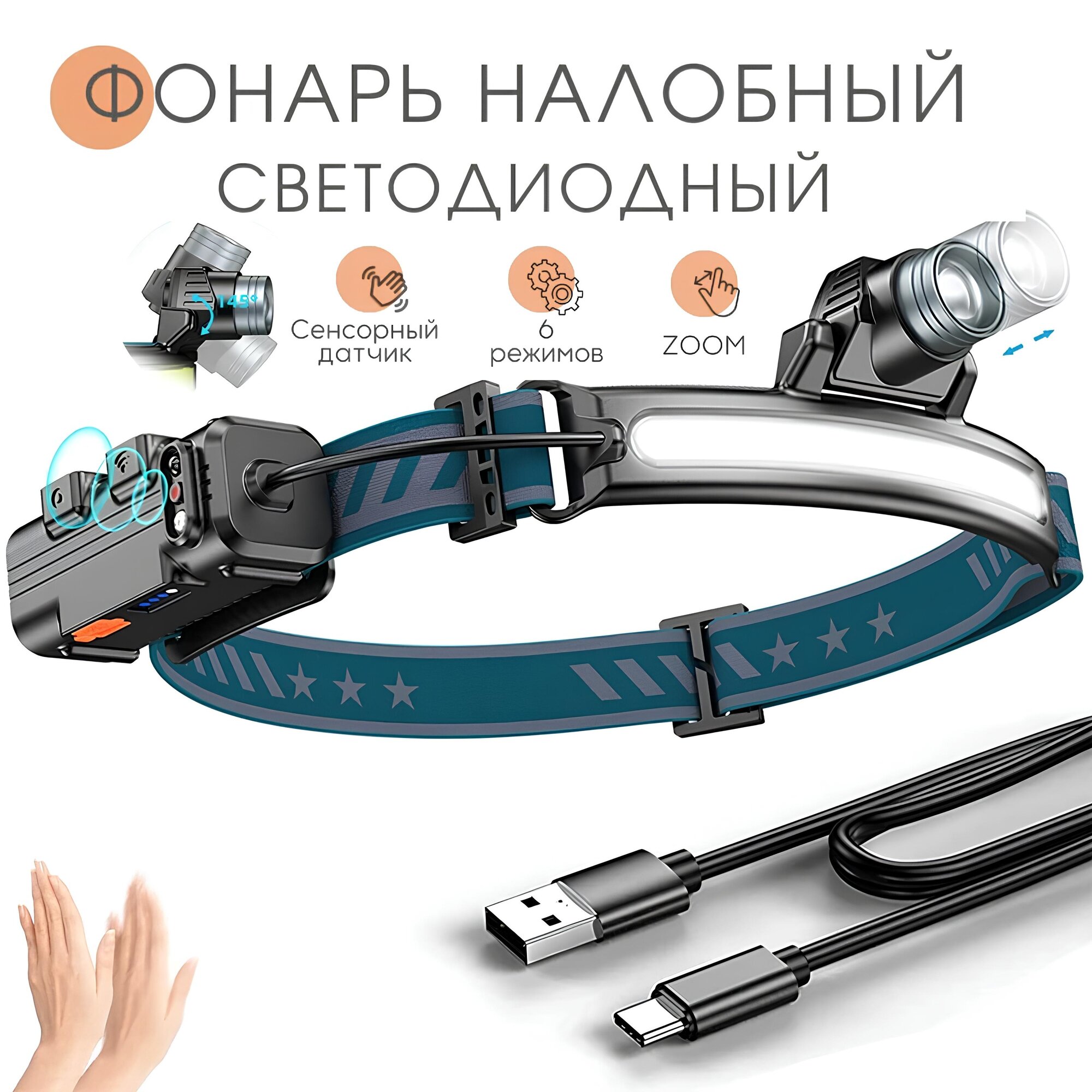 Фонарь налобный аккумуляторный светодиодный для кемпинга с датчиком движения/ Туристический кемпинговый походный фонарик для охоты и рыбалки/5 режимов