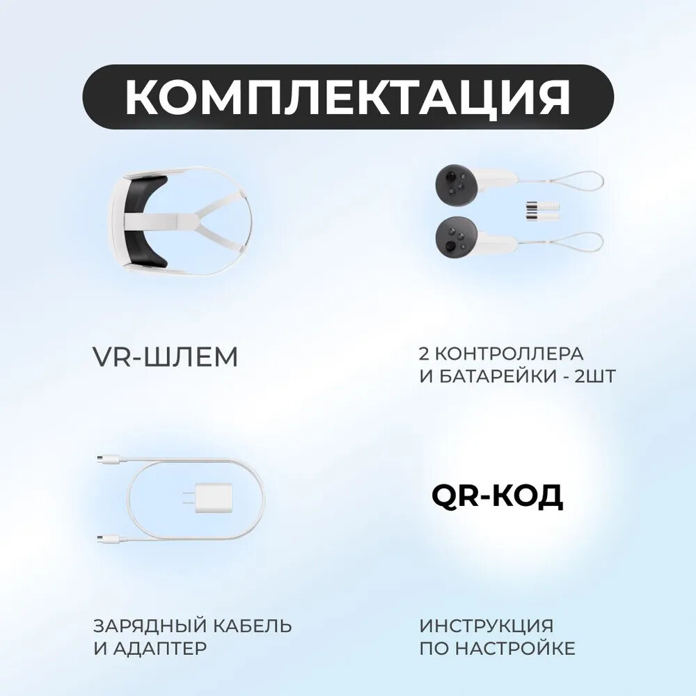 | Подробная комплектация | VRнетгарнитура Oculus Quest 2 64 GB, контроллер Oculus Touch нет 2 шт, кабель для зарядки, элемент питания АА нет 2 шт, аестьптер питания, проставка для очков |