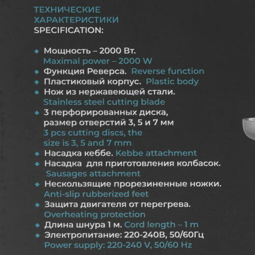 | Насадки | диск для фарша / насадка для кеббе / насадка для приготовления колбас |