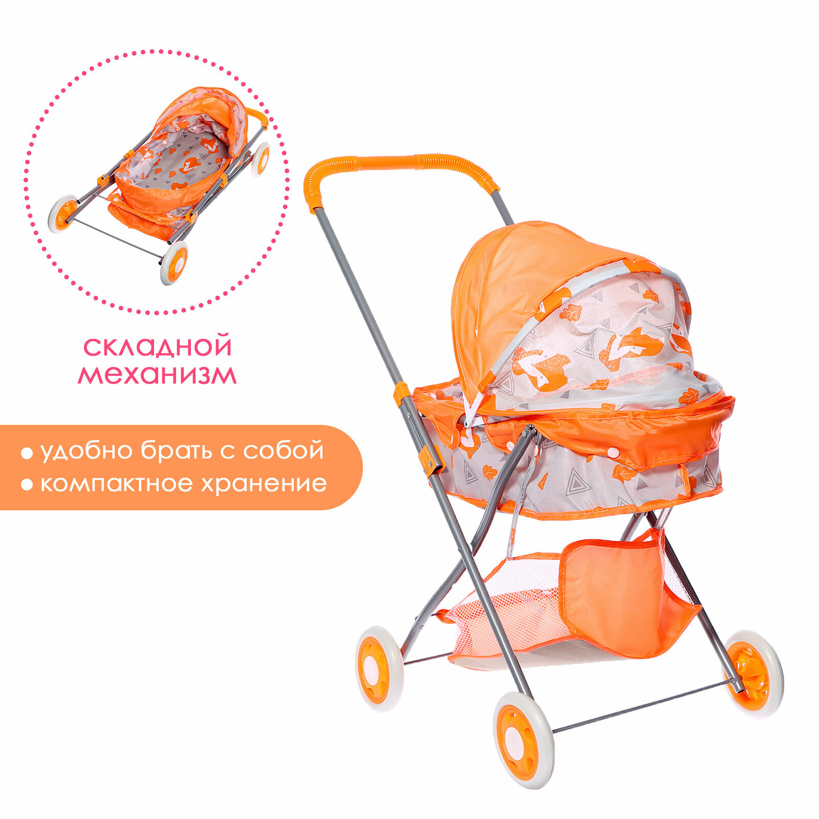 Коляска для кукол универсальная "Лисички", металлический каркас, с сумкой 9826084 .