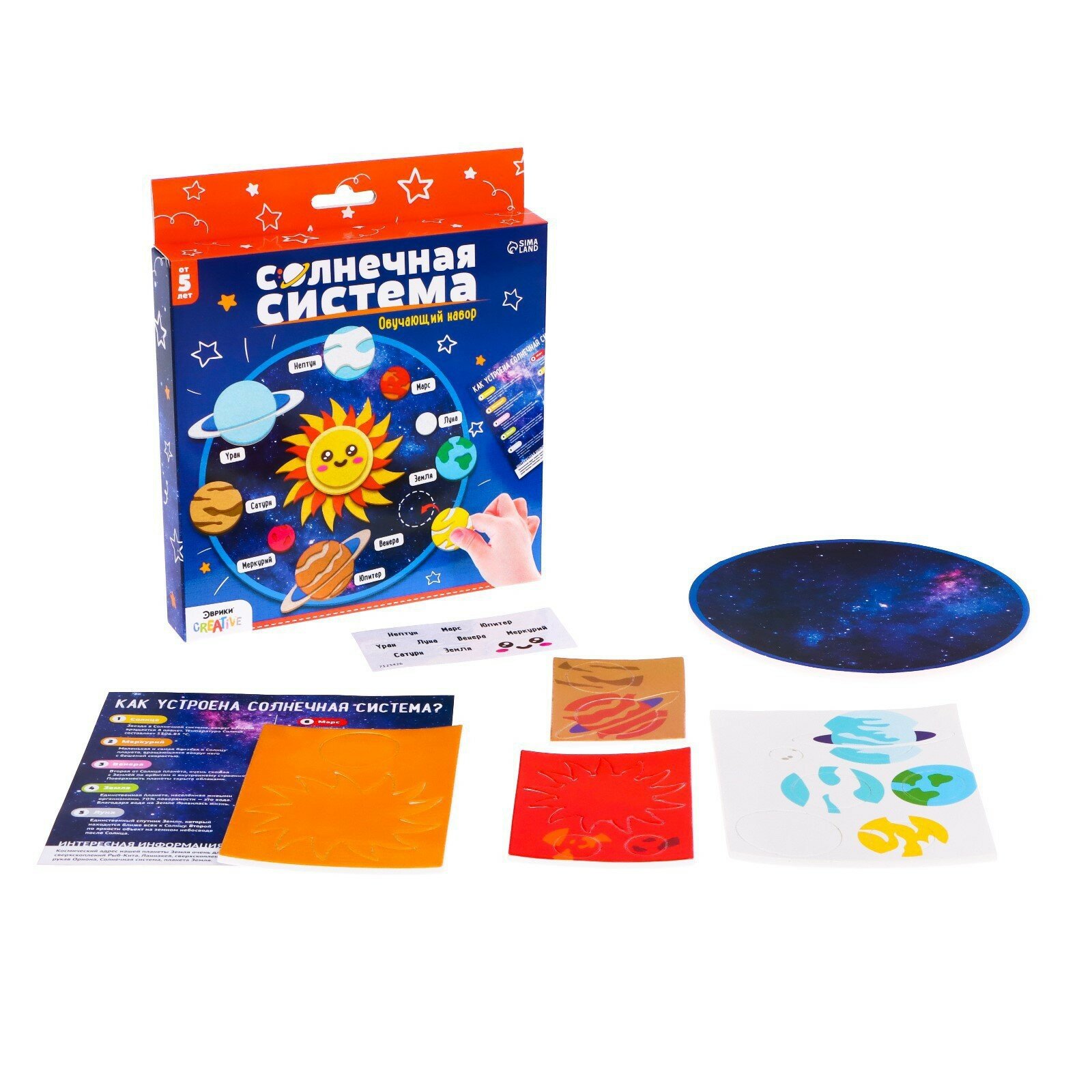 | Дополнительная информация | основа (картон, пенополистирол): 16 × 16 × 0,5 см; 12 планет на липком слое (картон, пенополистирол); обучающий материал(инструкция); наклейки с названиями |