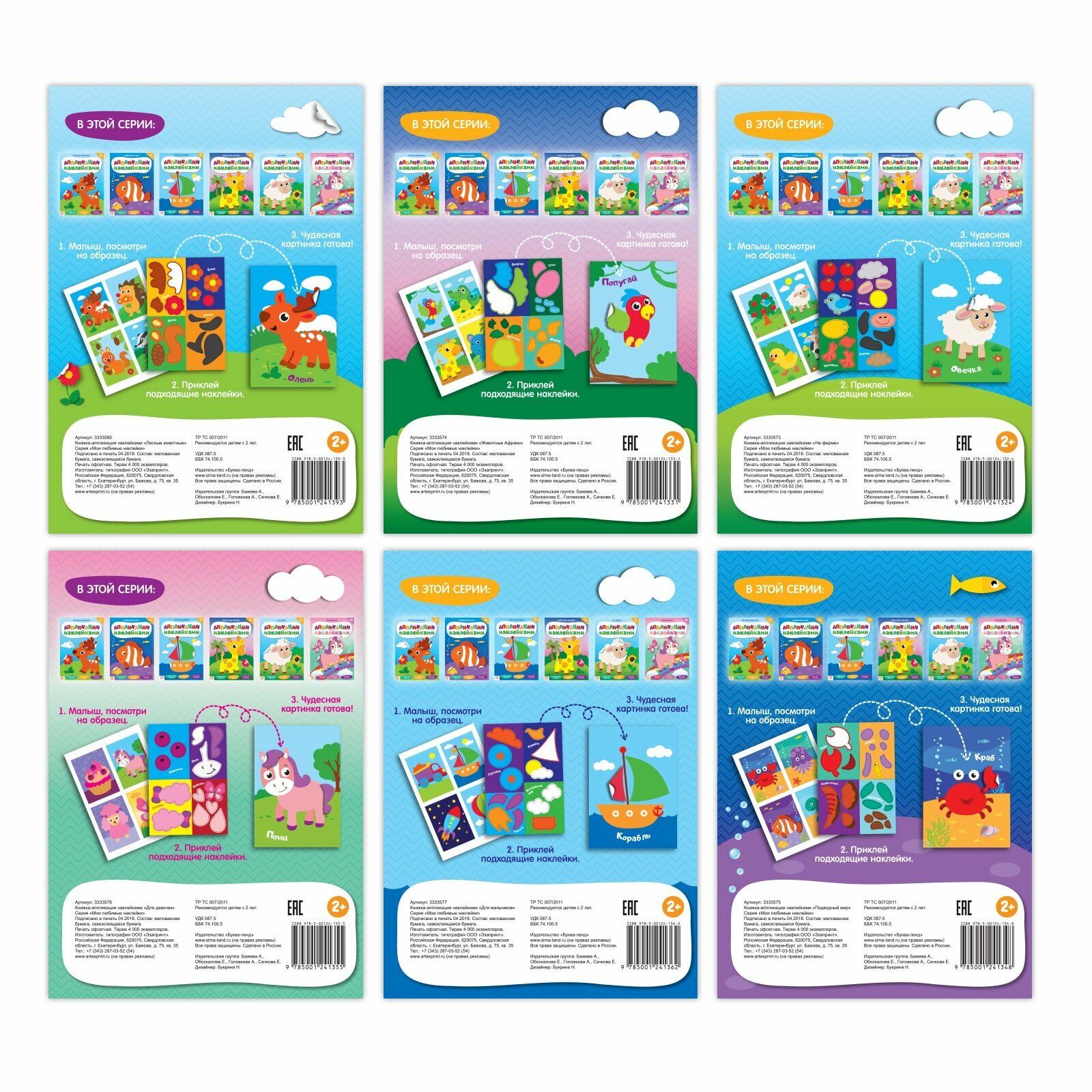 | Комплектация | Аппликации наклейками «На ферме» Аппликации наклейками «Лесные животные» Аппликации наклейками «Животные Африки» Аппликации наклейками «Подводный мир» Аппликации наклейками «Для мальчиков» Аппликации наклейками «Для девочек» |