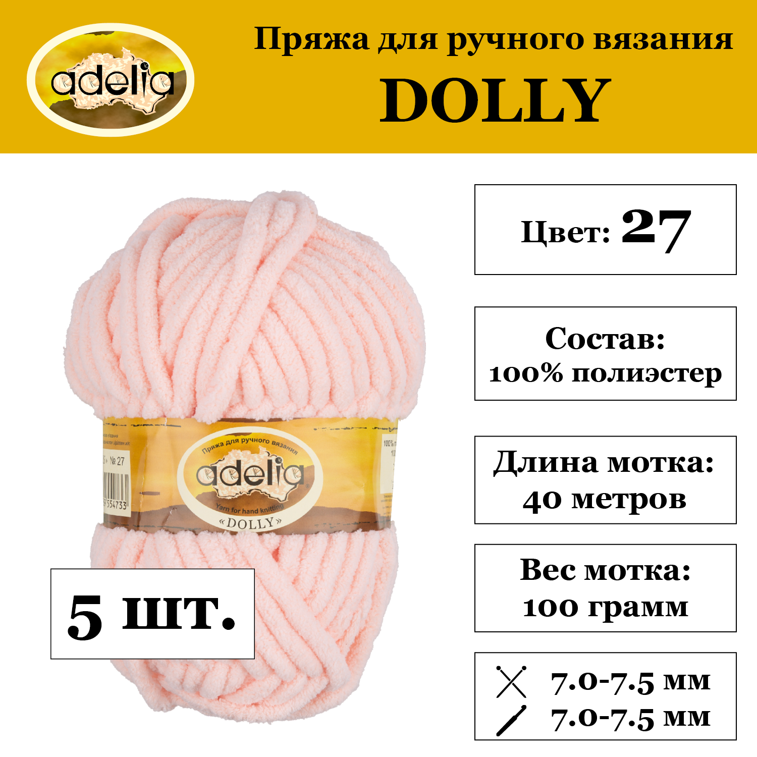 Пряжа Adelia Dolly, 100% полиэстер, 5*100 г, 40 м+-3 м, №27, светло-персиковый