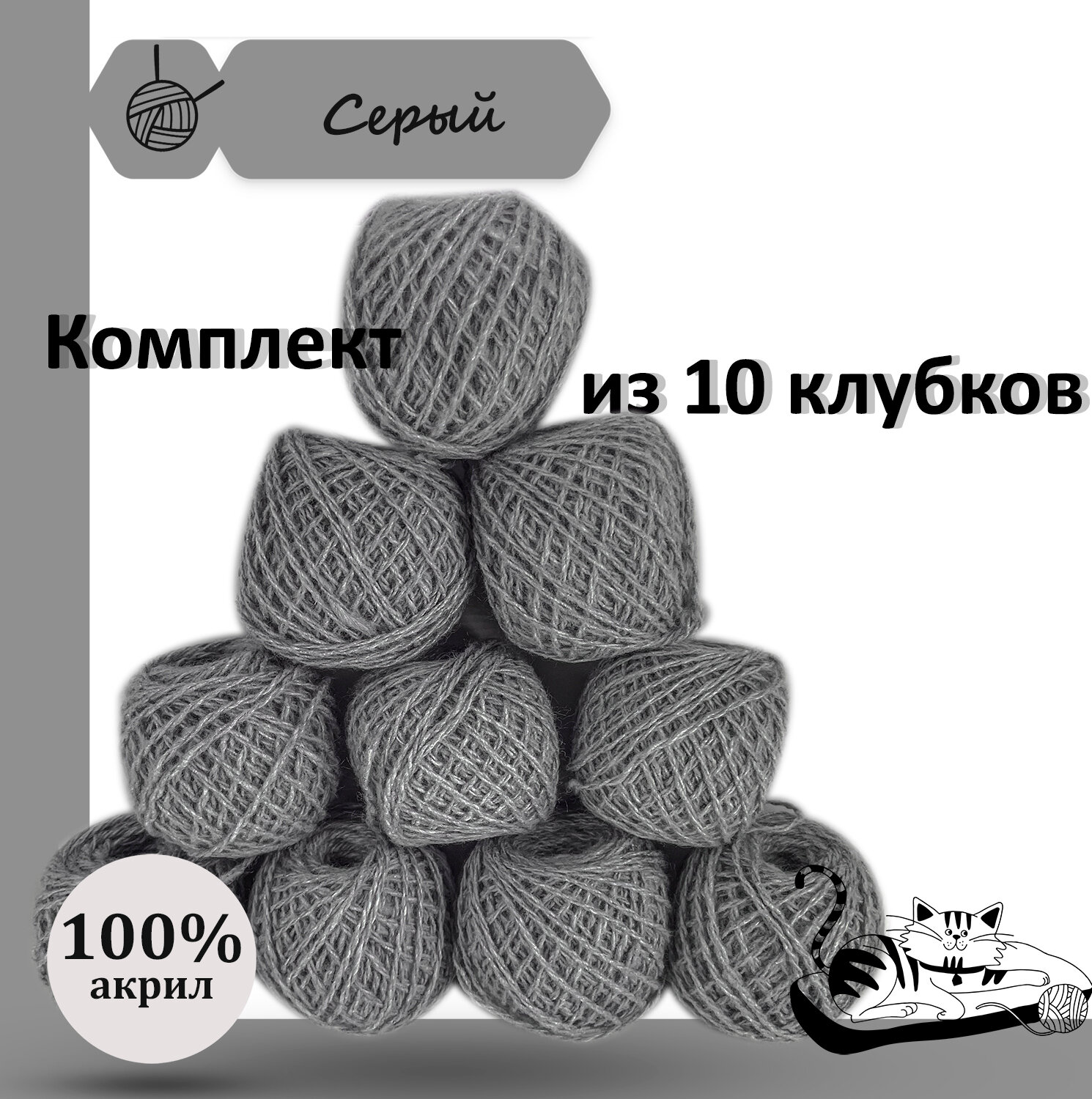 Купить Пряжа для ручного вязания в клубочках. Набор 10 штук. Моток 40 грамм / 70 метров. Серый