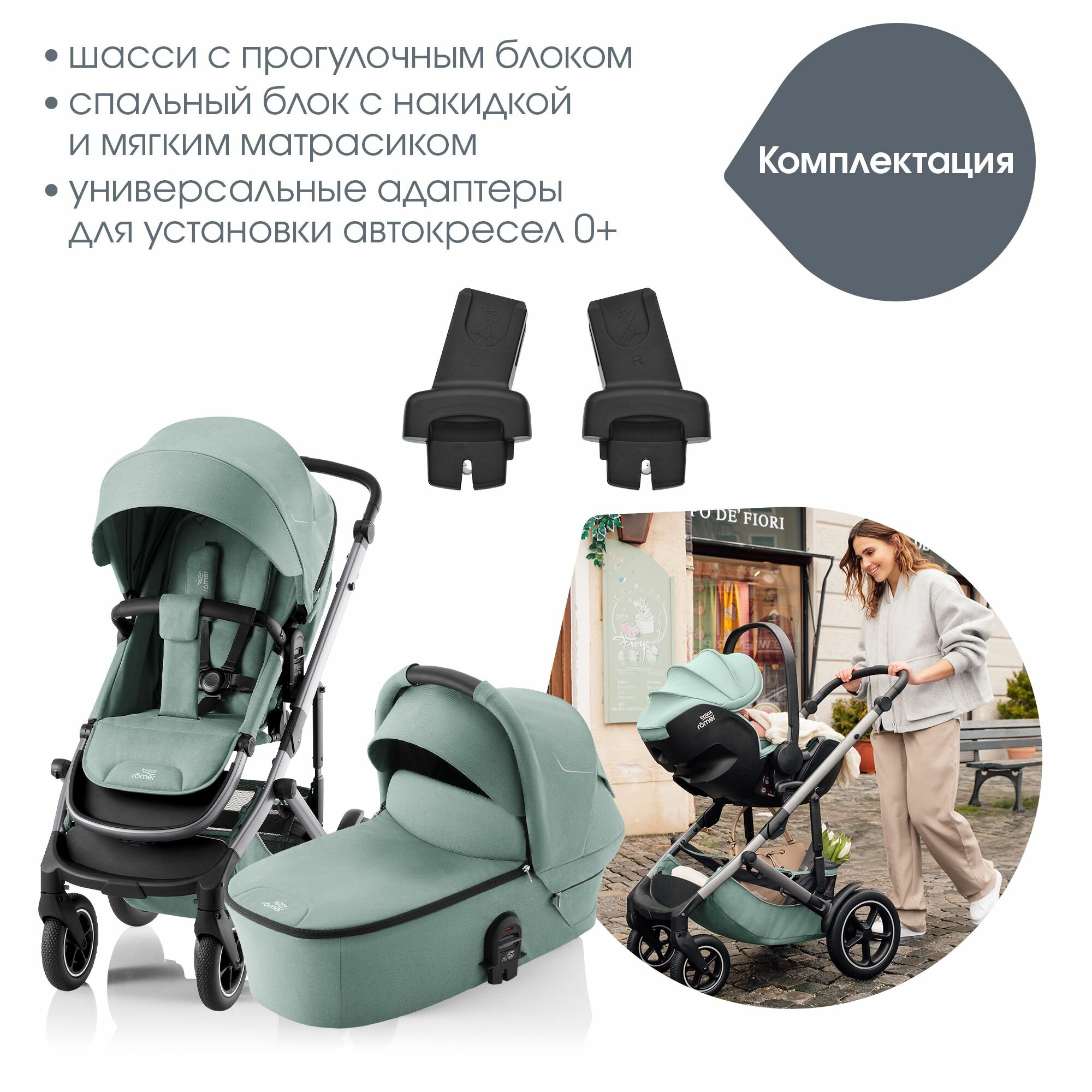 | Комплектация | Алюминиевое шасси с гелевыми колёсами и корзиной для покупок. Реверсивный прогулочный блок с капюшоном и бампером. Люлька с капюшоном / матрасиком и накидкой на ножки. Адаптеры для установки автокресла группы 0+. |